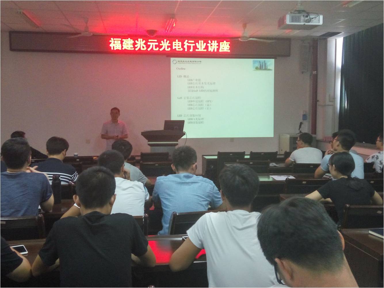 9月27号下午,福建兆元光电有限公司的技术高工和人力资源经理在材料楼404为成人网站 师生作题为“LED芯片的工艺流程及发展前景”的行业讲座。报告会由专业学位点负责人汪炳叔老师主持,学院教师和研究生积极参加了报告会。