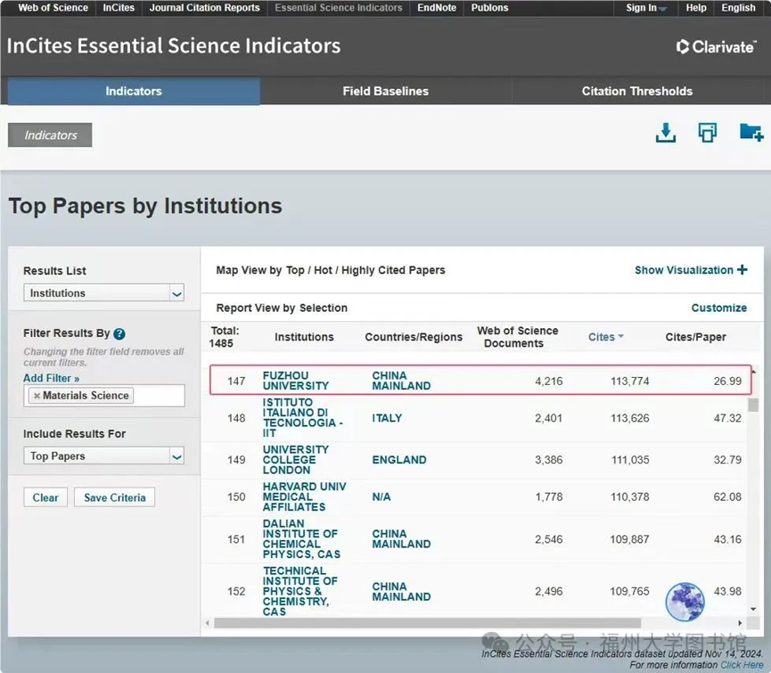 2024年11月14日,科睿唯安更新了ESI数据(2024年第6次更新,含10年8个月的收录论文及其引文信息)。此次数据涵盖的时间范围为2014年01月01日-2024年08月31日。数据显示:成人网站 材料科学学科首次进入ESI全球前千分之一行列,全球排名147名,全球共有1485个机构进入该学科前百分之一,成人网站 所处千分位为0.989‰。这是成人网站 第一个进入ESI全球排名前千分之一的学科,说明成人网站 学科建设取得阶段性成果。