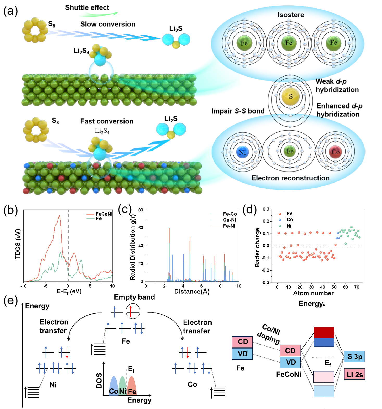 过渡金属纳米合金催化剂由于其d轨道电子的高活性,对多硫化锂具有优异的吸附、催化能力,被认为是改善多硫化锂“穿梭效应”和加速锂硫电池电化学动力学的有效手段,从而提升锂硫电池的性能。然而,合金化策略中催化剂电子结构和作用机理的影响仍需深入研究。文章中成功地合成了FeCoNi合金作为研究锂硫电池中多硫化锂催化转化的实例体系,并基于能带理论和电子轨道理论对其催化机理进行了深入的研究。研究发现:合金化FeCoNi催化剂的电子构型容易改变,通过Co和Ni原子掺杂,使得Fe周围构建独特的电荷环境,实现电荷再分配,可以改变金属Fe催化剂的特定能带和电子结构,进而改变了对多硫化锂的吸附和催化活性。这是首次在电子尺度上解析合金催化剂在锂硫电池中的催化演变机制,为合金催化剂在锂硫电池中的发展应用提供了新视角、新思想。