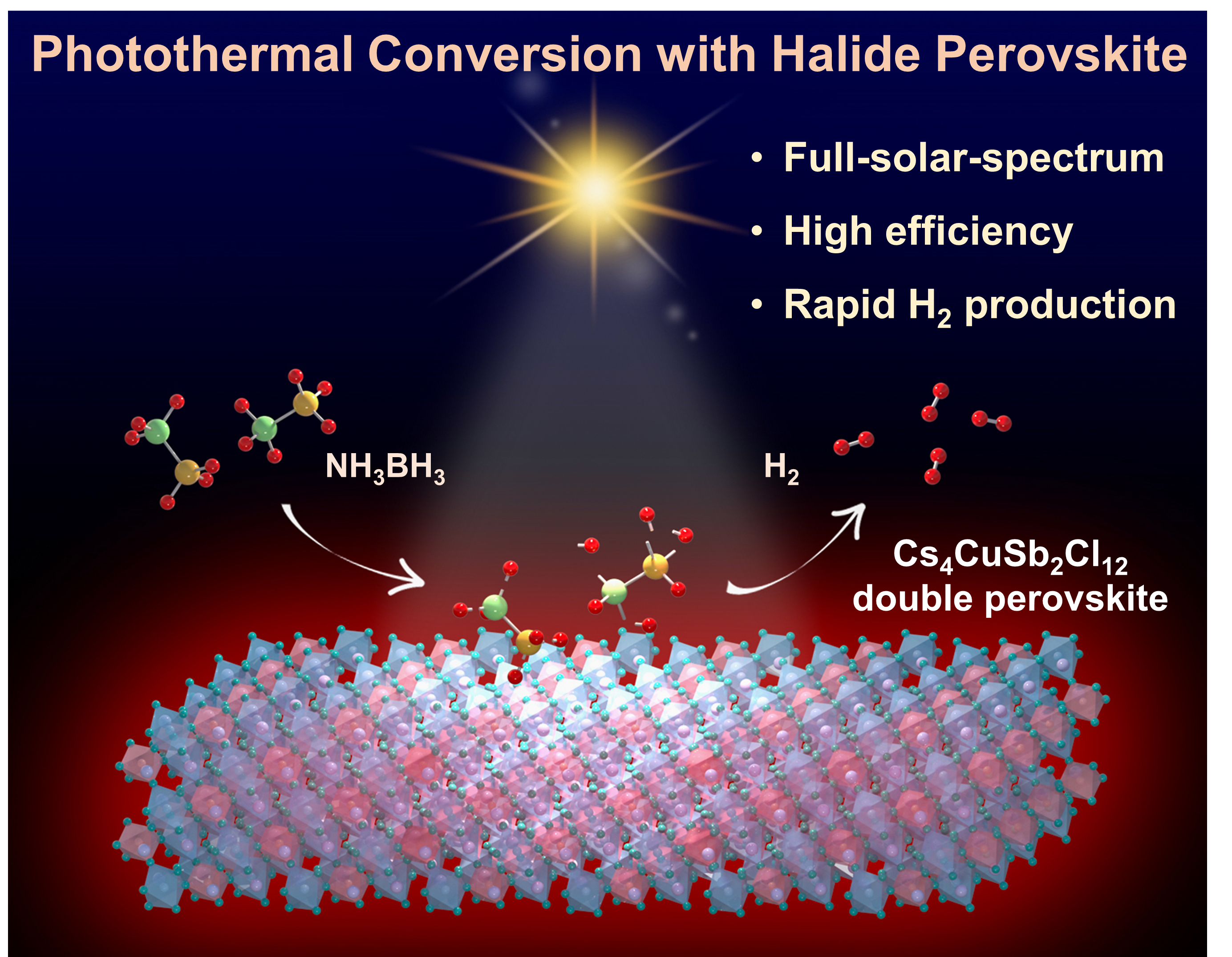 光热转换是利用全光谱太阳光能量的最有前景的途径之一。在基于半导体的吸光材料中,提高光热转换效率的关键在于以下两点:(1)降低带隙以捕获宽光谱范围的太阳光;(2)减少热损失以实现局域热效应。在本工作中,我们首次报道了利用卤化物钙钛矿 Cs4CuSb2Cl12作为光热材料进行高效的太阳能到热能的转换。该双元卤化物钙钛矿具有本征的窄带隙和超低热导率,实现了全光谱吸收(200-2500 nm),光热转换效率高达93.4%。优异的光热转换特性可用于固态氨硼烷温和条件下的快速光热诱导制氢,释放出2.0当量的氢气,光热活化效率高达12.2%,而且无需任何额外的热能或电能输入。Cs4CuSb2Cl12的光热制氢性能不仅为车载燃料电池的氢气供给系统提供了一种绿色、安全、节能和高效的方案,而且为卤化物钙钛矿在光功能材料领域的应用开辟了一个新方向。