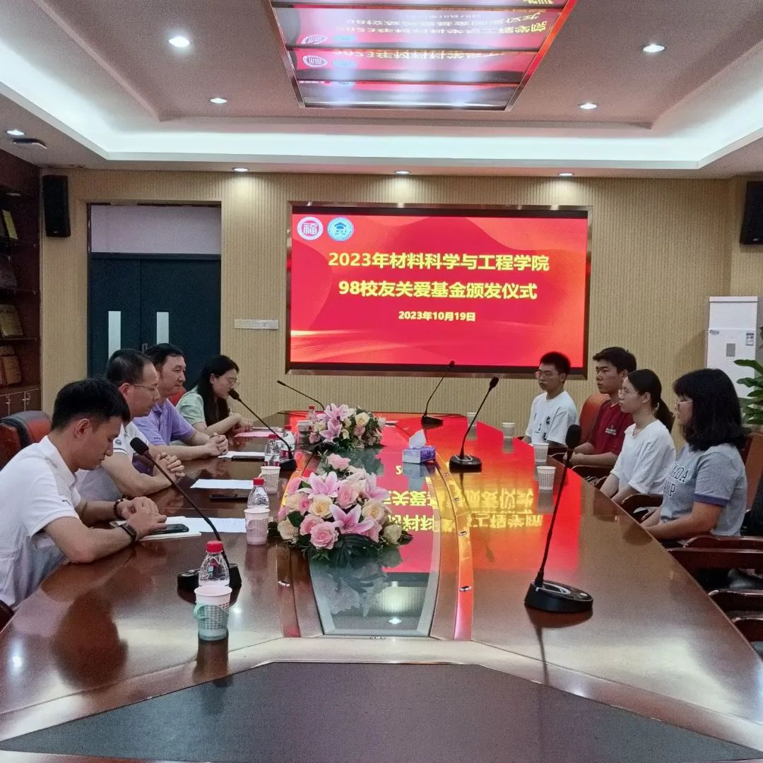 10月19日下午,材料学院于嘉锡楼313举行材料学院25周年院庆系列活动暨98校友关爱基金颁发仪式,1998级校友代表、98基金会葛旭东理事长、院党委张志忠副书记、辅导员张庭士老师出席,由辅导员张丽芬老师主持,受助师生代表参加。