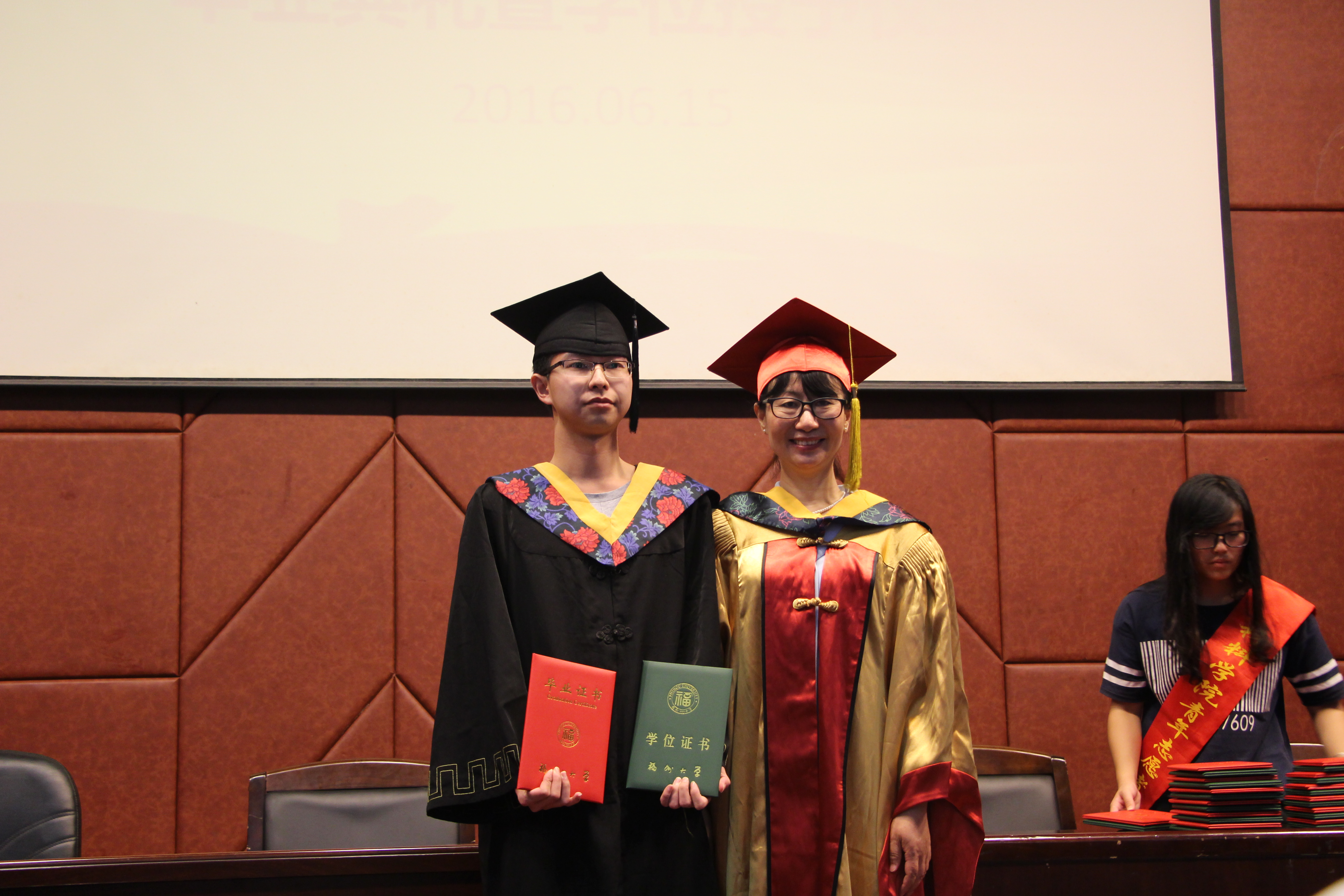 学位授予仪式开始,于岩教授宣读获得成人网站 工学学士学位的同学名单。随后,院长身穿金色学士服,头戴红色学士帽为毕业生授予学位证书、毕业证。伴随着悠扬的毕业歌,所有毕业生依次上台,与院长握手拥抱,向院长致谢,在拨穗后手持证书与院长合影留念,表达内心深刻的感谢与不舍。仪式结束后,毕业生们纷纷与老师、同学合影,在大学的最后一段日子留下自己的独家记忆。