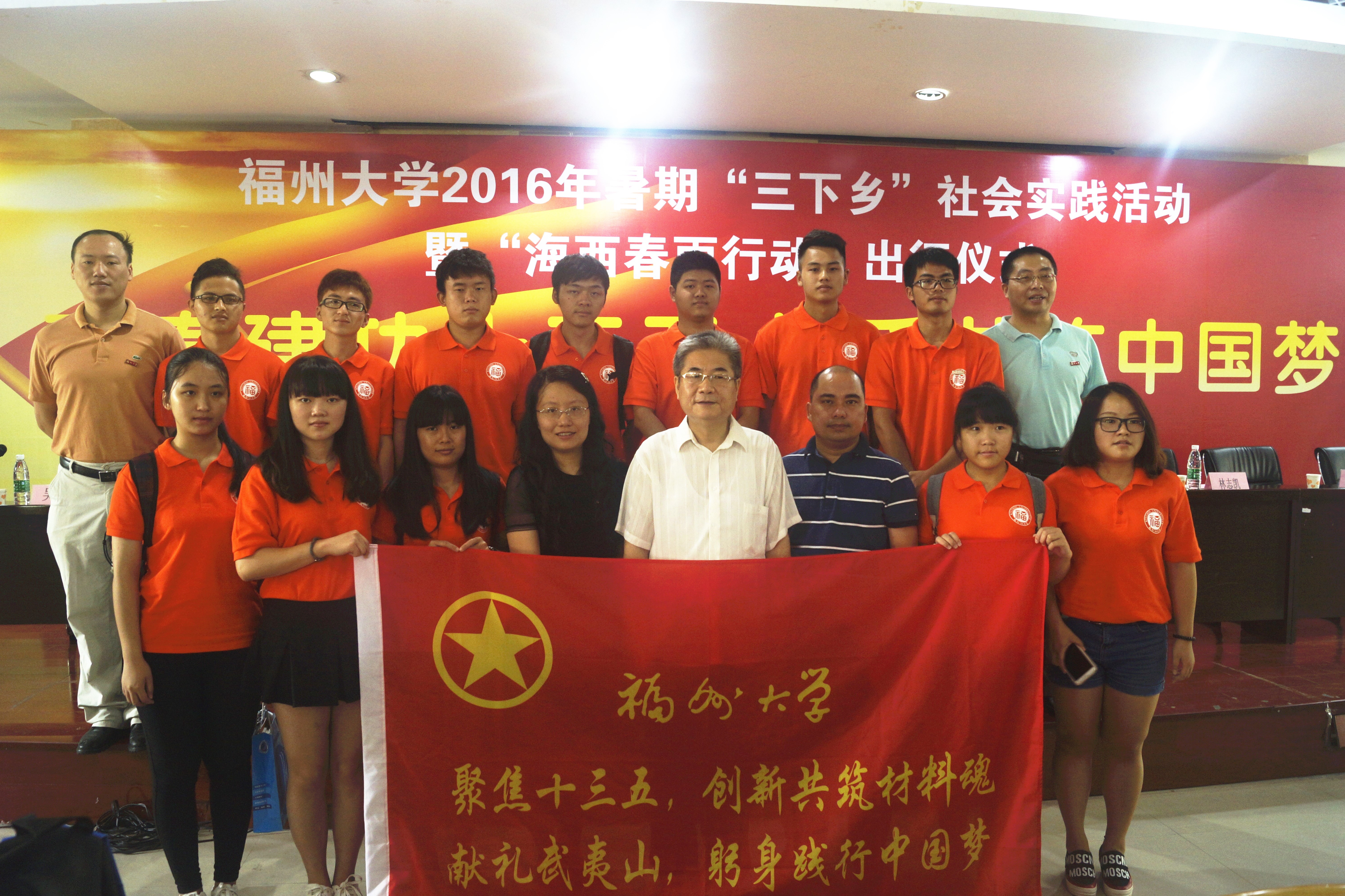 在出征仪式的最后,与会领导为各实践队授旗,正式吹响了暑期社会实践活动的号角。仪式结束之后,校党委副书记陈少平研究员、学生处副处长魏金明、校团委副书记吴雪与成人网站 王剑龙老师、卢杰老师及学生代表合影留念。