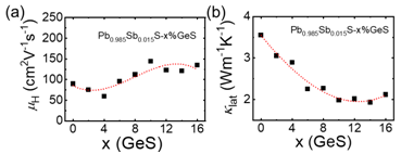 图1. 在PbS基体中合金化GeS时,形成的第二相Pb5Ge5S12与PbS基体实现了导带对齐,保证了载流子较高的迁移率(图a)。另一方面,由点缺陷(固溶的偏心Ge原子、掺杂剂Sb,以及S空位)、纳米尺度Ge和中尺度Pb5Ge5S12共同构成了多尺度分级结构,增强声子散射,有效降低了材料晶格热导率(图b)。