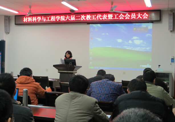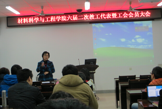 2016年1月21日下午,材料学院第六届第二次教工代表暨工会会员大会在材料科学楼404会议室隆重召开。本次会议应出席人数59人,实际出席人数56人,符合会议议程。会议由材料学院副院长于岩同志主持,学院王剑龙副书记致开幕词。会议听取并审议了院长工作报告、院工会工作报告;听取审议院财务收支情况报告和院工会财务收支情况报告。