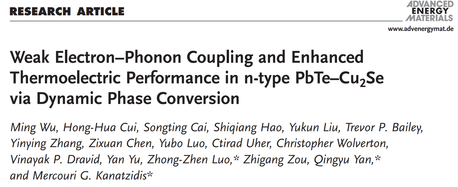 近日,成人网站 罗中箴教授与合作者在N型PbTe热电材料研究方面取得新进展,相关研究结果发表在《Advanced Energy Materials》(中科院SCI一区TOP期刊,影响因子29.698)期刊上。成人网站 热电功能材料实验室(2020年底依托成人网站 成立)博士生吴明为该论文第一作者,论文得到了邹志刚院士、新加坡南洋理工大学颜清宇教授和美国西北大学Mercouri G. Kanatzidis教授的指导,成人网站 为第一通讯单位。