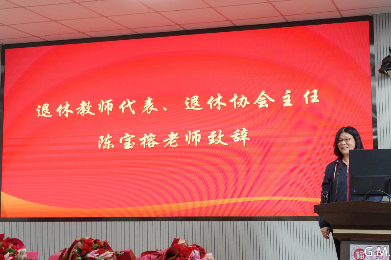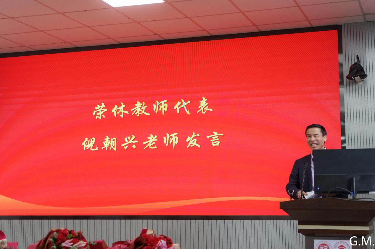 典礼伊始,学院播放了院工会精心制作的暖心视频以展现荣休教师对教育事业所作出的杰出贡献。随后,院党委倪朝霞书记上台致辞,倪书记首先代表学院党政班子和全院师生员工向长期以来为学院事业发展作出积极贡献的荣休教师们致以崇高的敬意和衷心的感谢。接着回顾了这七位荣休教师的工作情况,并给予高度的认可。发言最后,倪书记再次衷心祝愿荣休教师在未来的人生旅途中身体健康、生活幸福。倪朝霞书记致辞完毕后,荣休教师代表倪朝兴老师和退休协会主任陈宝榕老师也分别上台发言致辞。最后,院党委倪朝霞书记、袁珮执行院长、院党委张志忠副书记、林枞副院长、林梅金副院长为荣休教师们送上鲜花,并赠送纪念品。