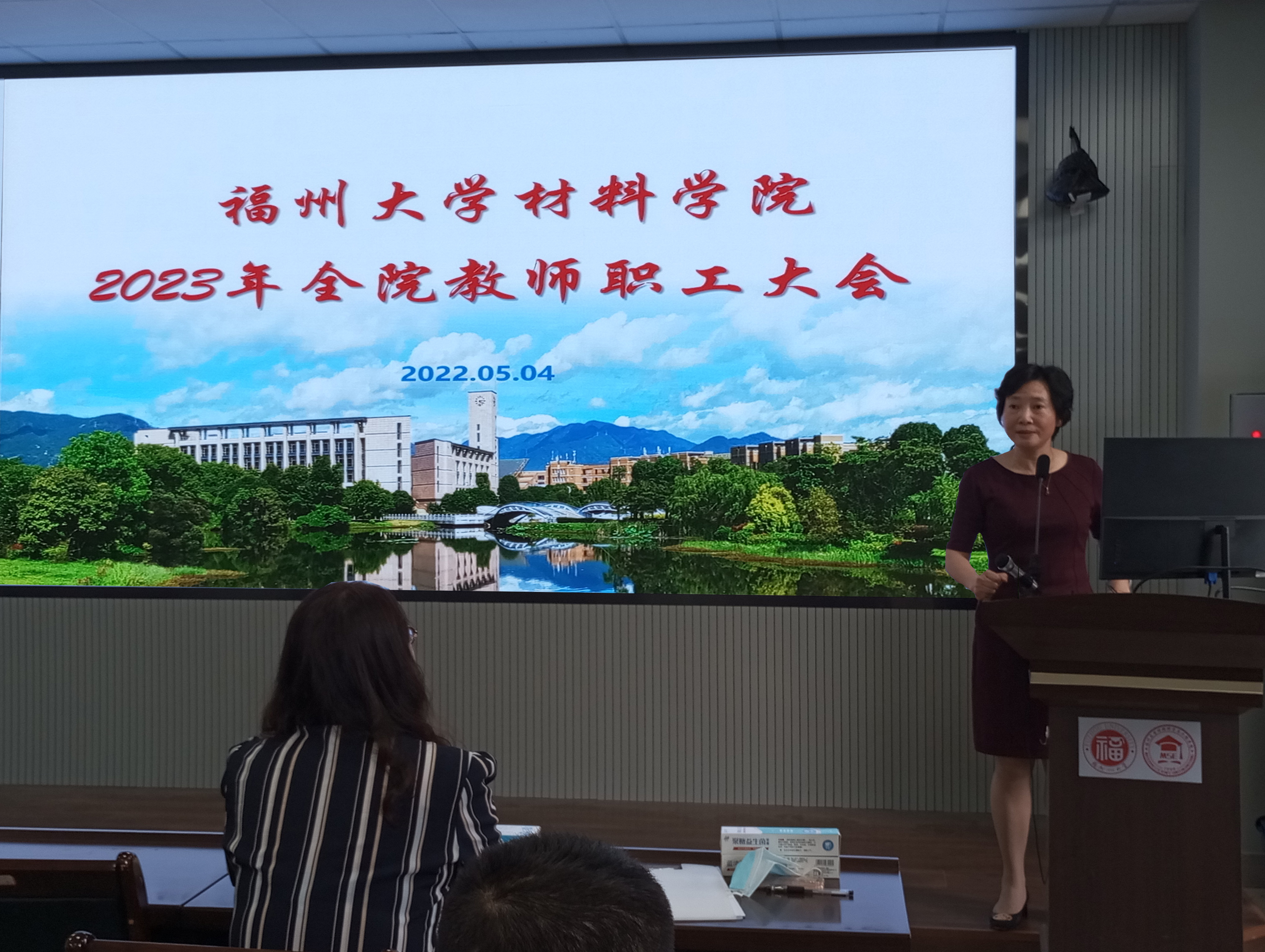 5月4日下午,材料学院2023年第二次全院教职工大会在材料楼404顺利召开。大会由院党委倪朝霞书记主持。会议伊始,倪书记代表学院热列欢迎三位新教师的到来,并邀请他们上台一一做自我介绍,介绍各自的研究方向和所在研究团队。