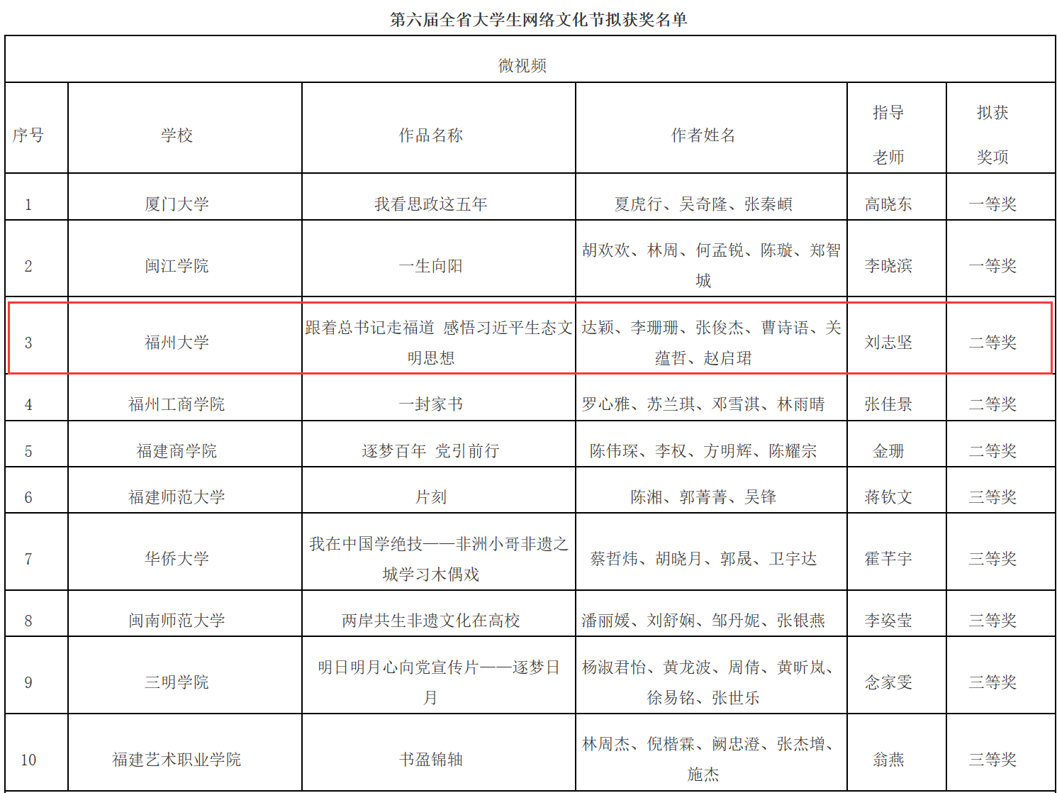 根据《关于第六届全省大学生网络文化节和全省高校网络教育优秀作品推选展示活动拟获奖结果的公示》,成人网站 微视频作品《跟着总书记走福道 感悟习近平生态文明思想》荣获二等奖,特此祝贺!