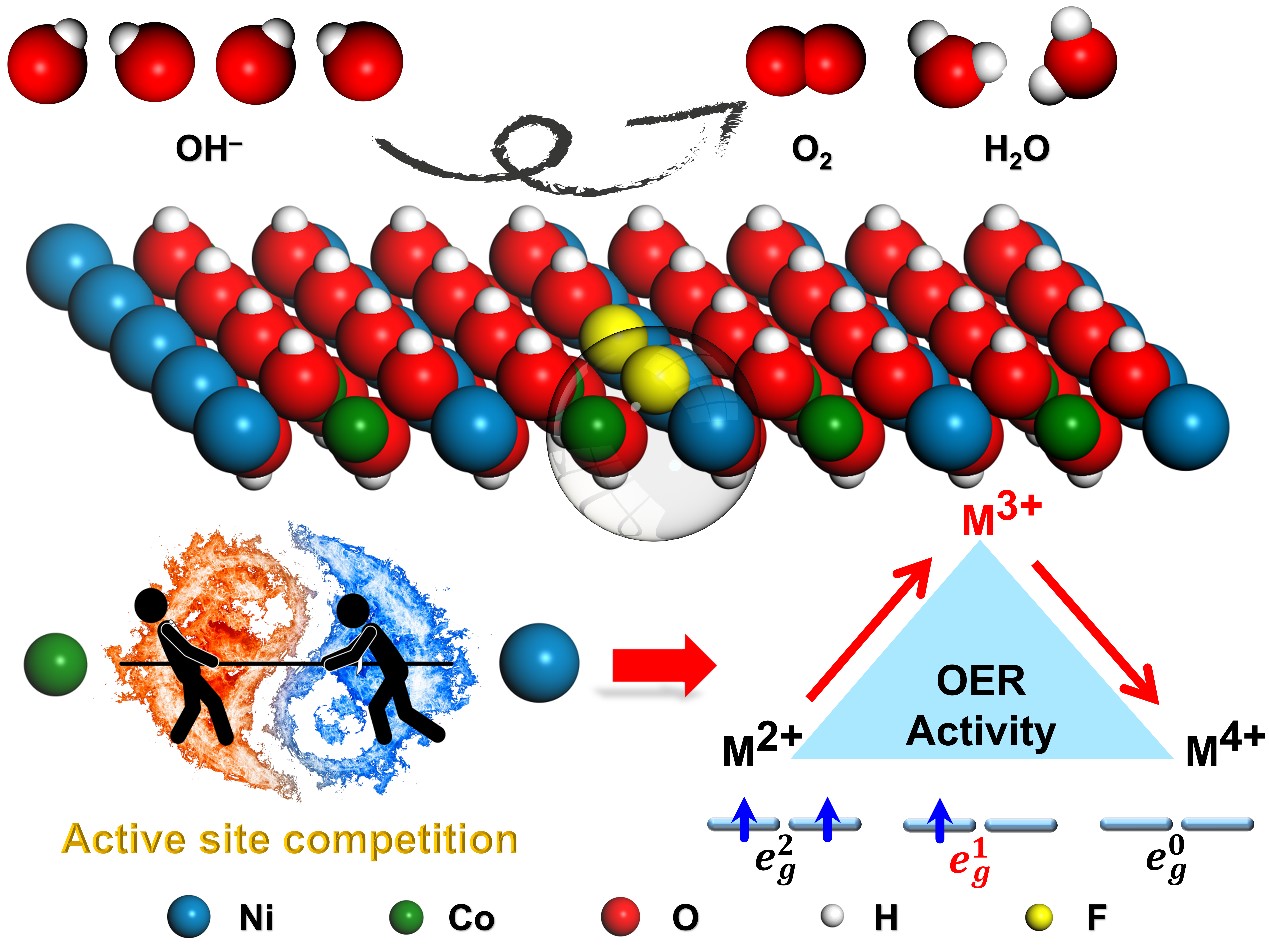 近日,成人网站 、新能源材料与工程研究院在电解水析氧催化剂研究方面取得新进展,相关成果以“Ni and Co Active Site Transition and Competition in Fluorine-Doped NiCo(OH)2 LDH Electrocatalysts for Oxygen Evolution Reaction”为题发表于Top期刊《Small》(JCR 1区,IF=13.3)。