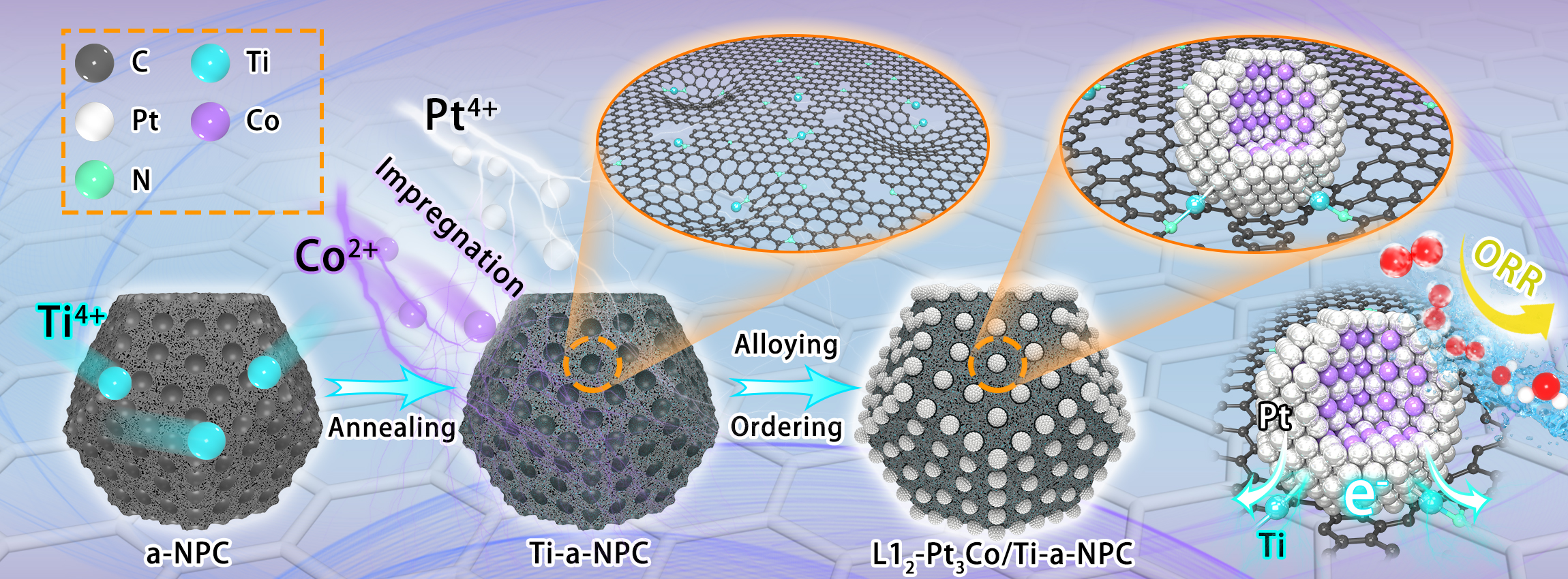 铂基催化剂的耐久性问题以及氧还原反应(ORR)的缓慢的反应动力学,严重阻碍了质子交换膜燃料电池(PEMFC)的商业化发展。在这项工作中,通过设计Ti单原子修饰的活性氮掺杂多孔碳(Ti-a-NPC)作为催化剂载体,构筑了超小尺寸Pt基金属间纳米颗粒约(2.62 nm),作为高效且持久的氧还原电催化剂。修饰在Ti-a-NPC表面或孔中的Ti单原子能够锚定Pt基金属间纳米颗粒,不仅使Pt基金属间纳米颗粒具有超小尺寸,而且能够在ORR过程中抑制其脱落与迁移。此外,Ti单原子与Pt基金属间纳米颗粒之间会形成Pt-Ti键,缓冲Pt基金属间纳米颗粒向N原子的电子转移,从而优化活性位点对含氧中间体的吸附性质,提高了催化剂的本征活性。所制备的催化剂(L12-Pt3Co/Ti-a-NPC)质量活性是商业Pt/C催化剂的11倍(1.765 A mgPt-1),并且在经历30 000圈加速耐久性测试后,质量活性仅下降了3.7%,而商业Pt/C则下降了37.1%。