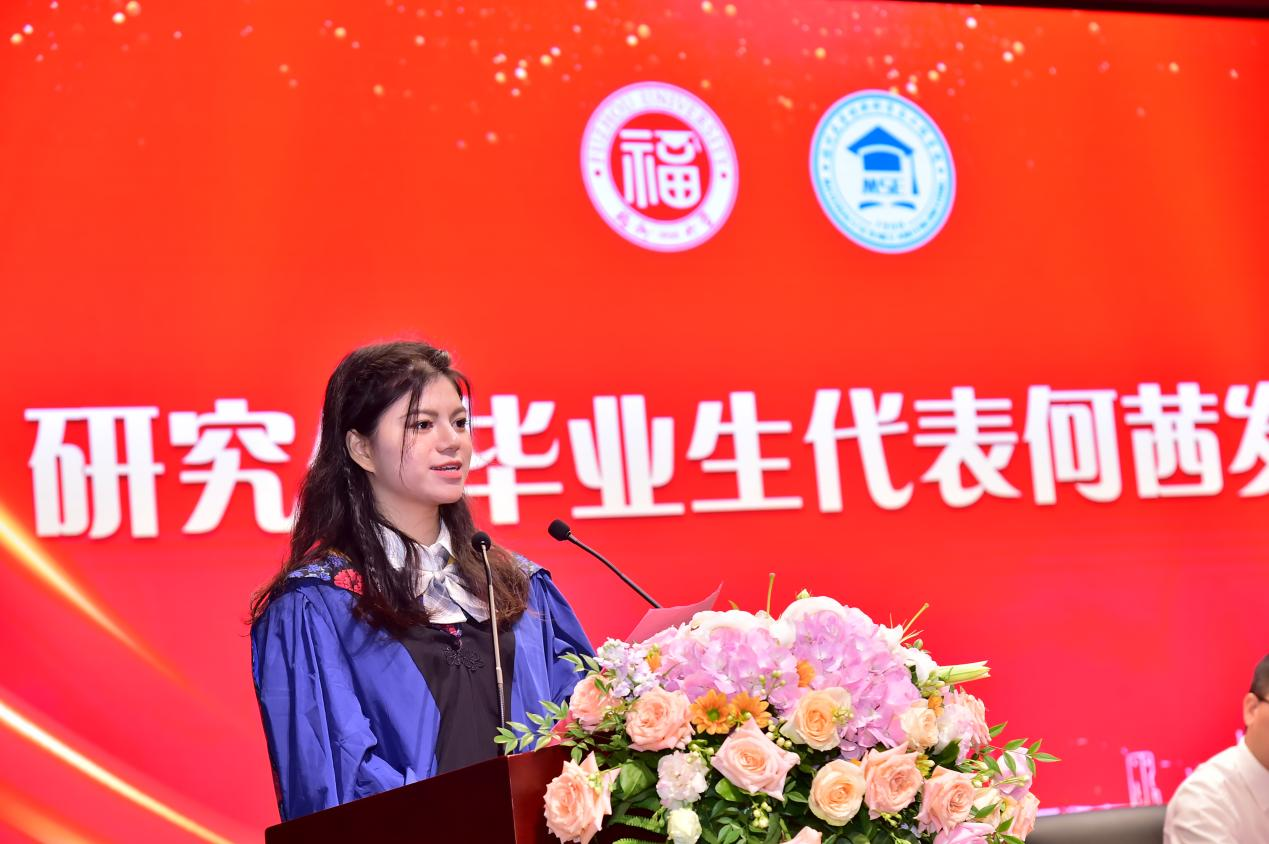 研究生代表何茜同学从自身经历出发,勉励大家脚踏实地,勤于实践,以智慧和汗水浇灌梦想,用勤劳和踏实铸就未来,以实际行动和卓越成就为母校增光。