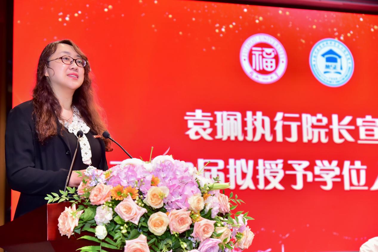 国歌奏毕,执行院长袁珮教授宣读《2024届毕业生拟授予学位人员名单》,每一个名字都是对他们在校学习和生活的肯定,也是对他们在未来生活能够再续辉煌的期许。