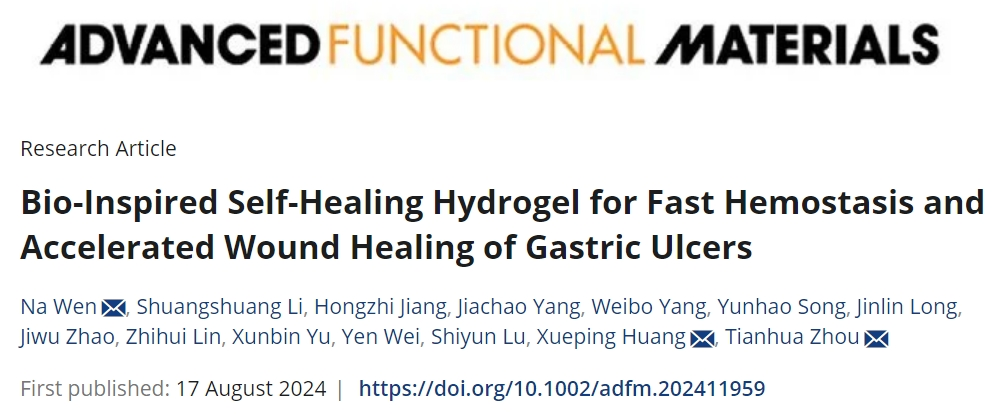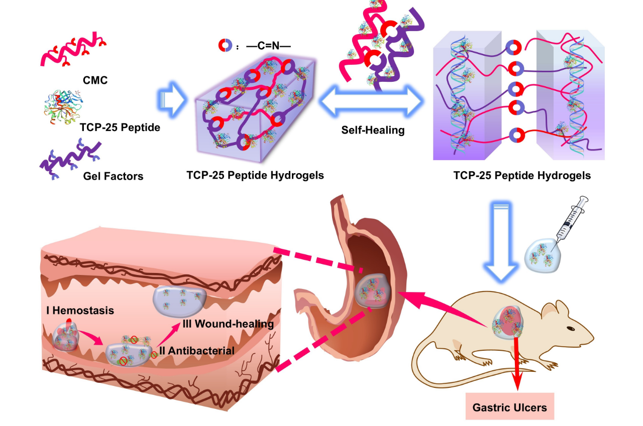 胃溃疡是一种全球性常见的消化系统疾病,临床上伴随急性或慢性出血的胃溃疡严重威胁患者生命,调查显示,成年人每年胃溃疡的发病率为10%-20%。伴有急性或慢性出血的胃溃疡有很大的致命风险。然而,如何在胃溃疡出血时实现快速止血和伤口愈合,是一项艰巨的挑战。目前的临床治疗方法包括质子泵抑制剂和胃黏膜保护剂等,但其效果均不尽如人意,为了应对这一挑战,近日,成人网站 温娜与附属省立医院黄雪平、联合中国科学院物构所周天华研究员等人,受人体内源性防御机制的启发,以凝血酶衍生的C末端肽(TCP-25)作为靶向因子,并通过Schiff碱反应将其结合到两种新型可注射且生物相容的羧甲基壳聚糖(CMCs)基水凝胶中,设计开发了两种新型仿生TCP-25肽水凝胶。该TCP-25肽水凝胶实现了对急性或慢性胃溃疡出血的快速止血和创面愈合,显示出良好的临床应用前景。相关工作以“Bio-Inspired Self-Healing Hydrogel for Fast Hemostasis and Accelerated Wound Healing of Gastric Ulcers”为题发表在《Advanced Functional Materials》上(Adv. Funct. Mater. 2024, 2411959)。