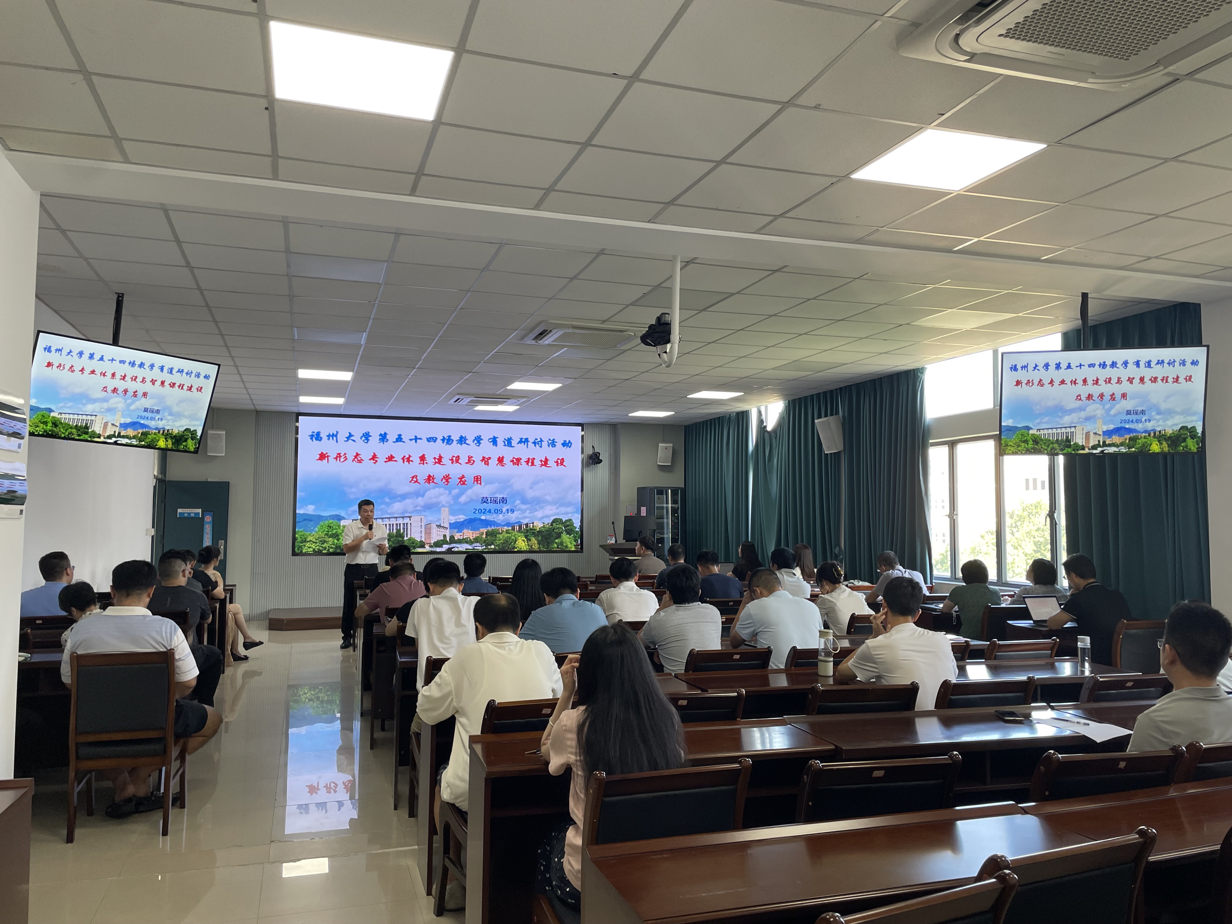 莫经理从智慧课堂的建设背景、设计原则及操作流程等多个方面,向教师们介绍了构建高质量智慧课程的思路和方法。通过实操演示和案例分析,展示了智慧课程在教学中的广泛应用,深入探讨了智慧课程对教学管理、教师及学生的多维价值,以及在优化资源配置、促进教学创新、提升教学质量等方面的效用。与会人员还就借助人工智能技术构建适应未来需求的专业人才培养方案,推进教学模式和评价体系有效革新等方面进行了互动讨论。