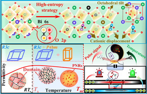 人工智能和大数据处理的终端是庞大的电力系统,储能介质是其中的一个重要分支,需要具备优异的储能特性和安全性。在高电场下,储能介质的温度会升高而带来安全隐患,开发兼具超高能量密度和智能温度自监测功能的新型储能介质是未来发展的趋势。高熵陶瓷电容拥有优异的储能效率,但传统高熵系统中构型熵与极化之间的矛盾极大地制约了储能密度的进一步提升。