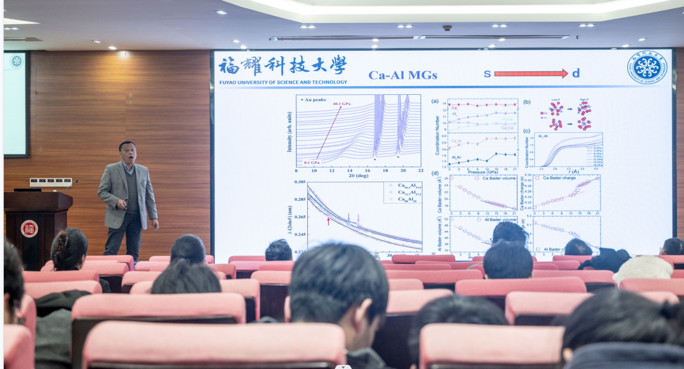 第六个报告来自福耀科技大学的蒋建中教授,报告题目为“Pressure/Temperature-induced structural changes in disordered materials”。蒋建中教授介绍了非晶金属玻璃的结构、性能及其应用领域。重点讨论了材料有序到无序转变的条件,生动有趣地给同学们阐述了不同压力、温度下材料熔体如何转变成非晶的过程与原理。