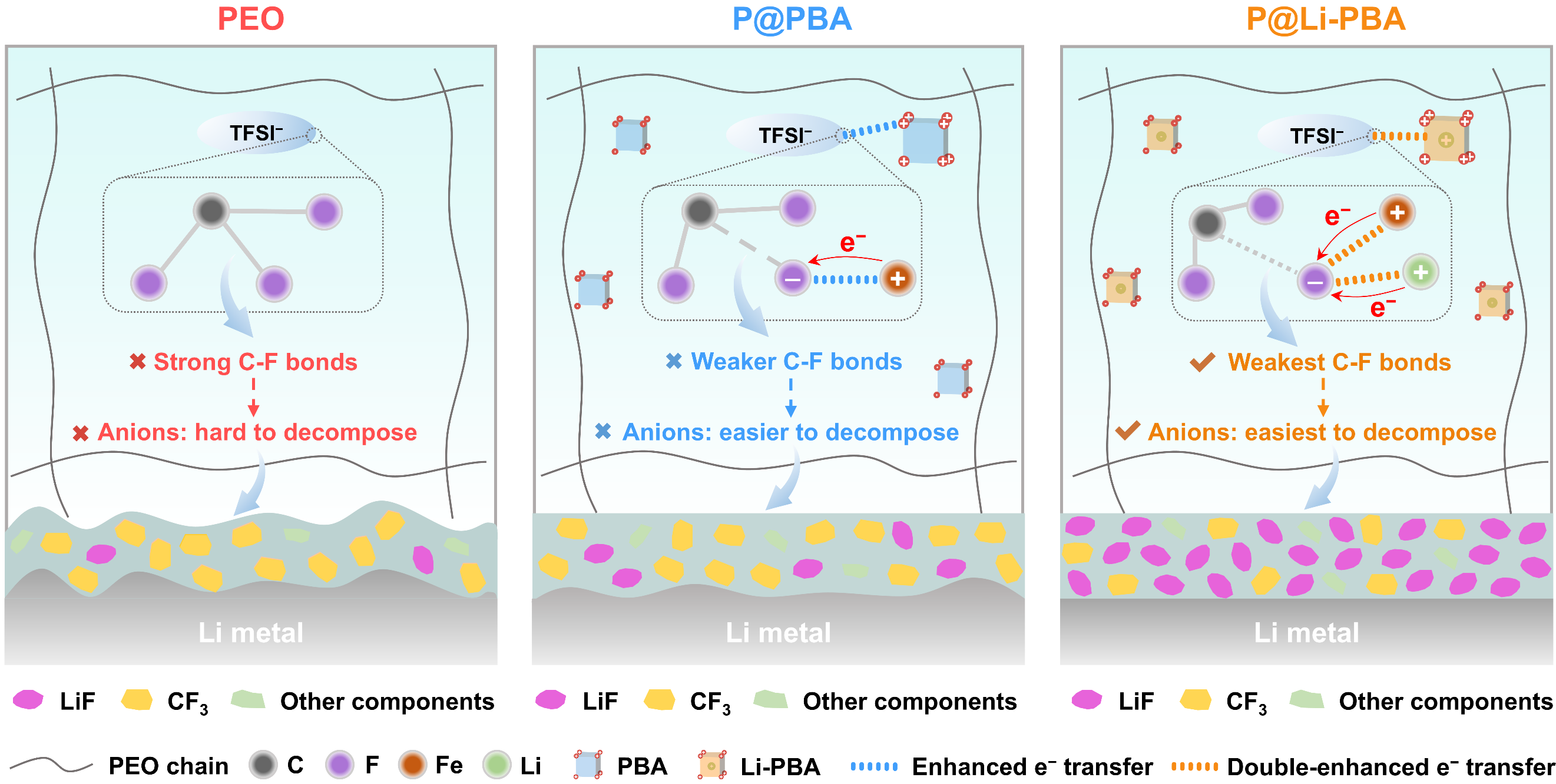 固态锂金属电池凭借其卓越的能量密度与安全性前景,已成为能源存储领域的研究热点(Yun Zheng*, et al., Adv. Funct. Mater. 2024, 34, 2404427; Yun Zheng*, et al., Adv. Mater. 2024, 36, 2314120, ESI 1%, 高被引论文)。其中,固体聚合物电解质(SPEs),例如聚环氧乙烷(PEO)基SPEs,因其轻质、柔韧性好、成本效益高、易于规模化生产以及与电极良好的相容性等优势而备受关注(Yun Zheng*, et al., Angew. Chem. Int. Ed., 2025, e202508857; Yun Zheng*, et al., Angew. Chem. Int. Ed., 2025, e202502728)。然而,传统SPEs与高活性的锂金属通常会自发反应形成不稳定的固态电解质界面(SEI),严重损害电池性能,缩短循环寿命,并可能带来严重的安全风险。构筑富LiF成分的SEI是很好的界面稳定化策略,其中的F一般来自SPEs常用锂盐LiTFSI中的C-F键,因此增强电荷转移以促进C-F键断裂是构筑富LiF稳定SEI的关键。目前的相关策略主要集中在设计非金属极性基团及相关结构上。而利用金属基电子供体来促进C-F键断裂和LiF形成的方法在很大程度上尚未得到探索。