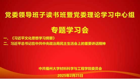 2025年2月25日,材料学院在嘉锡楼313会议室召开第三次党委理论学习中心组专题学习会。会议由学院党委书记罗涛主持,学院党委委员、部分教师代表参会,林梅金副院长列席会议。