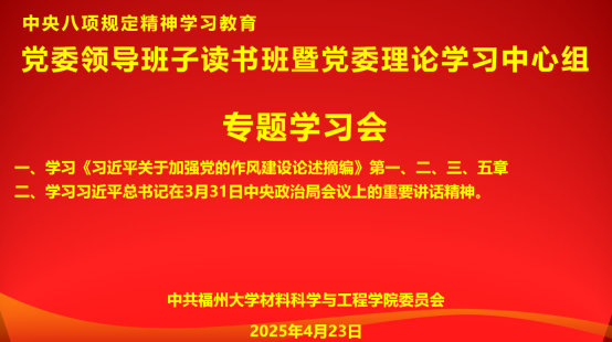 2025年4月23日,材料学院在嘉锡楼313会议室召开第九次党委理论学习中心组专题学习会暨党委领导班子第3期读书班。会议由学院党委书记罗涛主持,学院党委委员、部分教师代表参会。