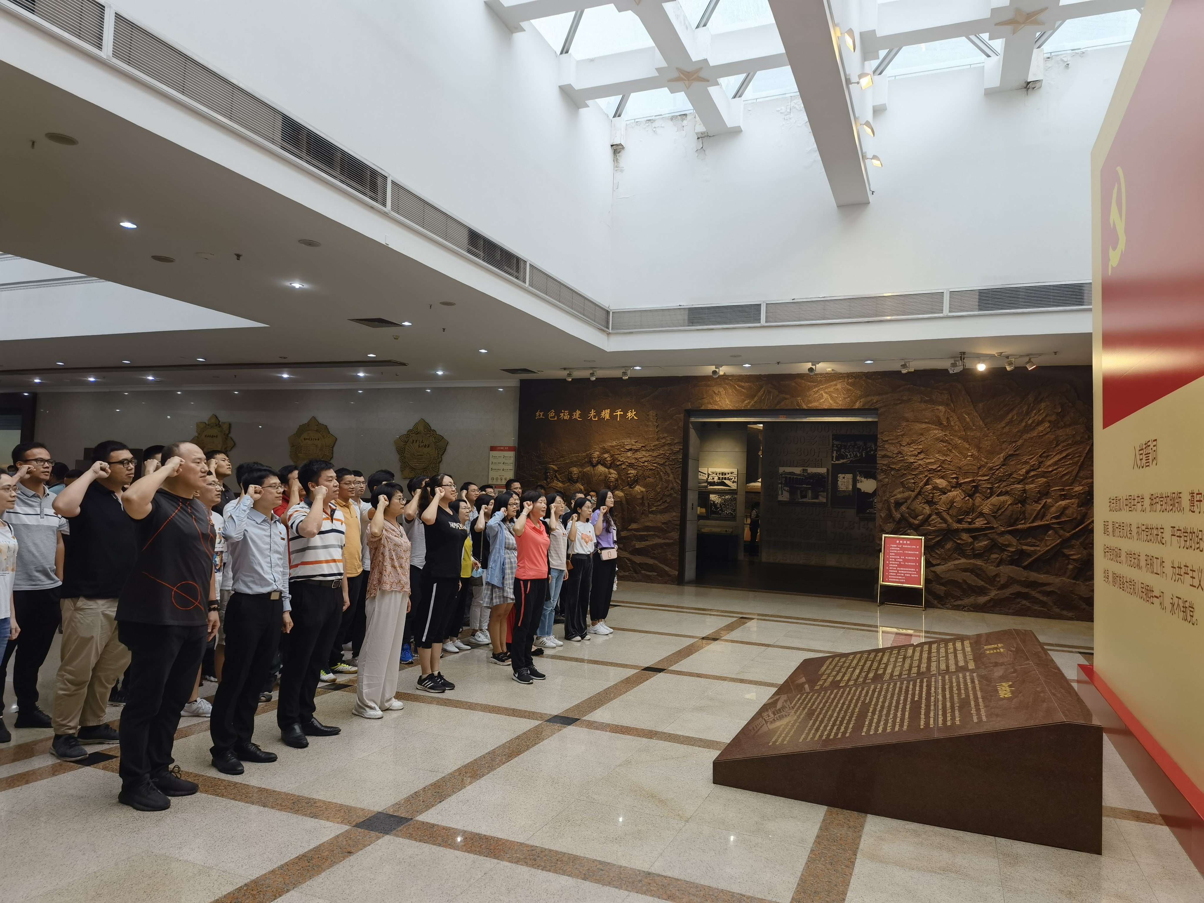 随后,全体党员走进“红色福建”主题展,参观了“饱经忧患不屈抗争”“国共合作唤醒工农”“土地革命创建苏区”“浴血长征三年苦斗”“团结御侮奋勇抗敌”“壮大力量迎接解放”等内容。展馆中一张张珍贵的照片、一件件真实的物件、一份份宝贵的档案,让在场的党员对1840年鸦片战争到1949年新中国成立的百年历史风云有了更深入的了解,每一位同志的内心都被深深触动了。
