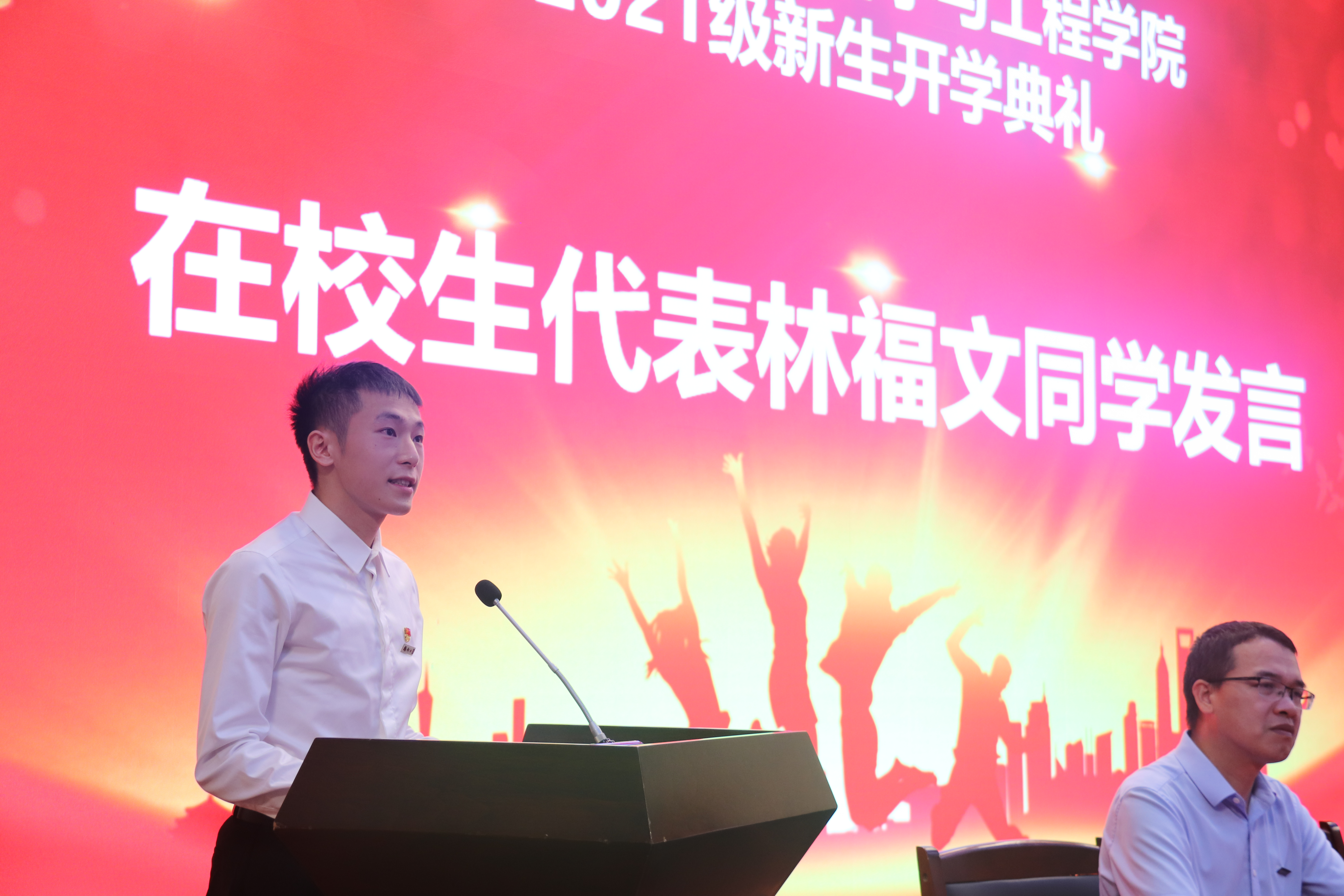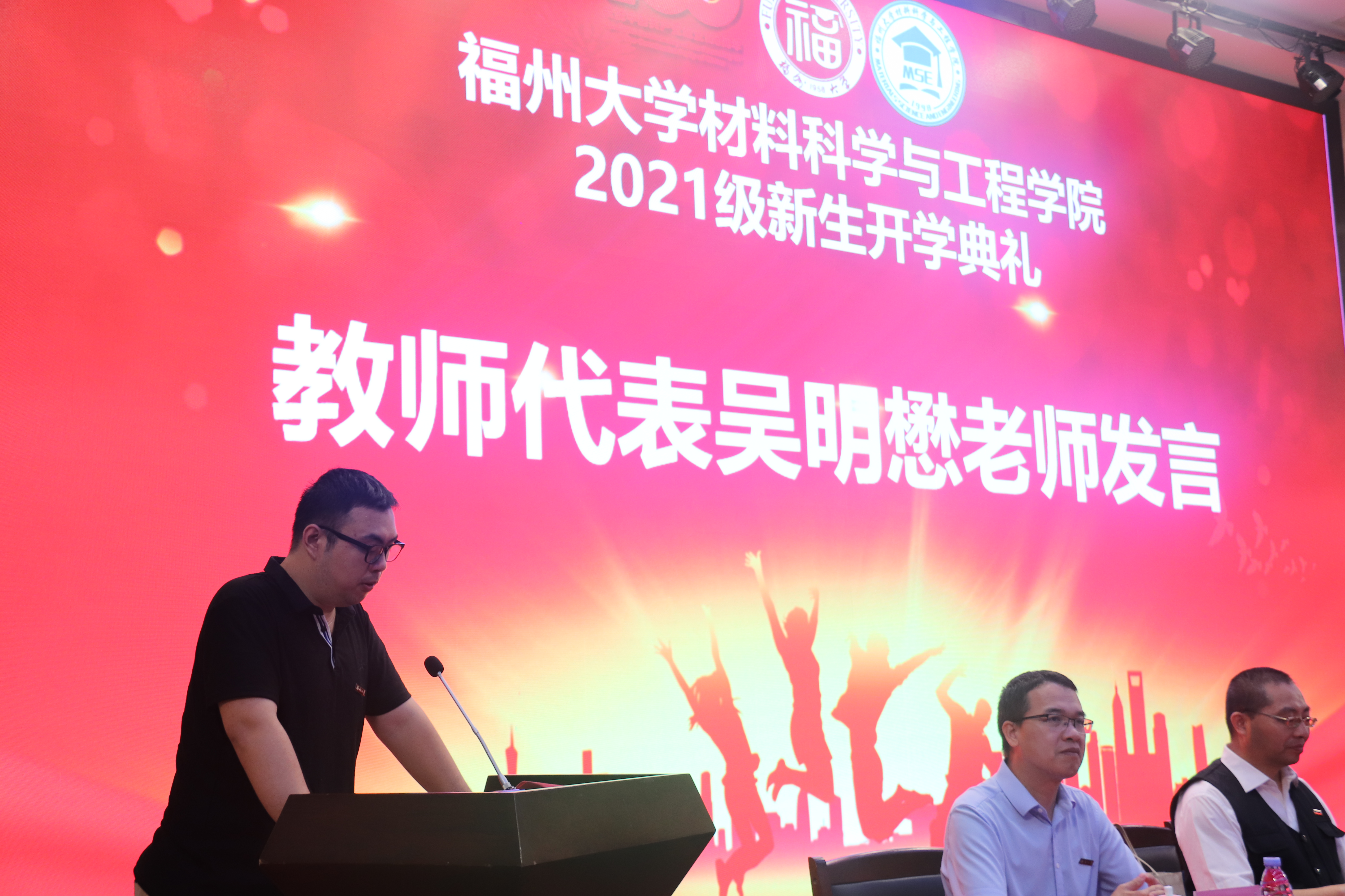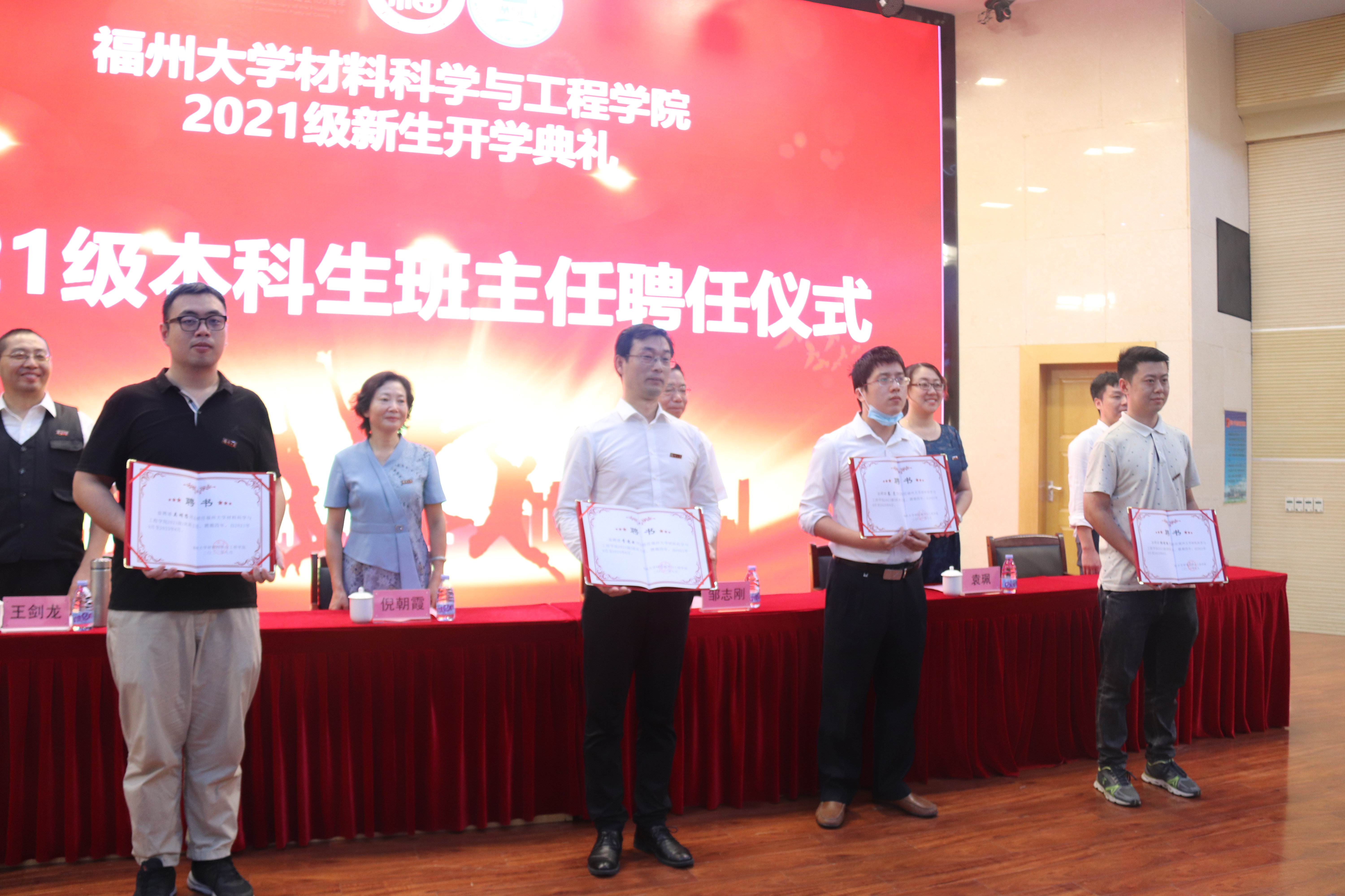 接着在校本科生代表林福文同学发言。林福文同学结合自己在学习、科研、学生工作等方面的经历引导同学们思考要如何度过未来的大学生活,希望同学们勇于拼搏,敢于创造,展现出新时代福大材料学子的清风正气、风华正茂。随后研究生新生代表叶立帆同学与本科生新生代表万侃同学相继发言。他们都表达了对未来学习生活的期待,并且要秉承“陶冶品质,淬砺刚强”的院训绽放青春芳华。紧接着,学院领导为2021级新生班主任吴明懋、李凌云、高旻、杨程凯四位老师颁发聘书。