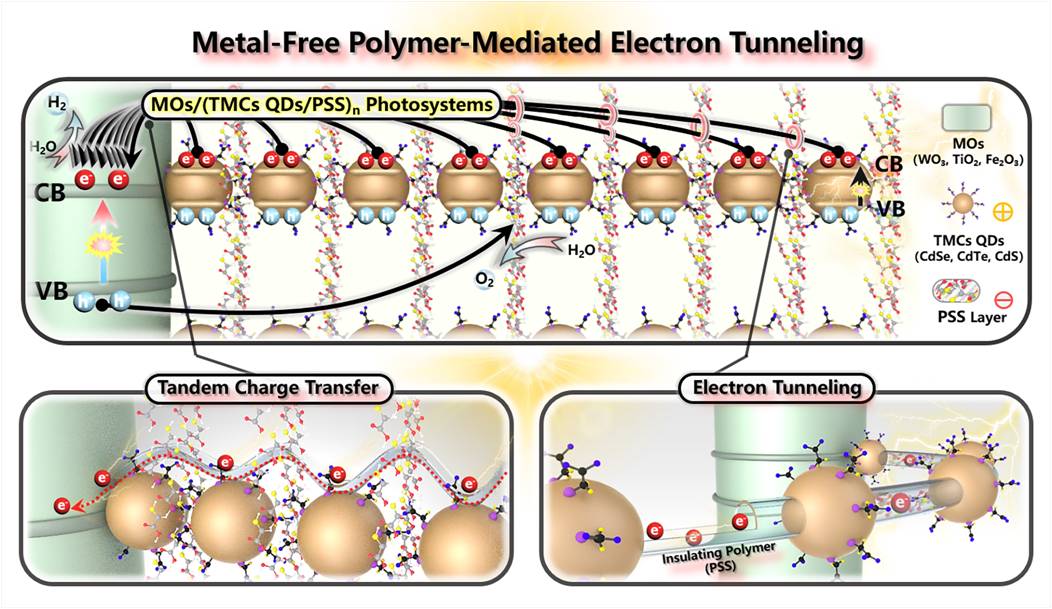 本工作中,作者利用层层自组装策略,实现过渡金属硫族化合物量子点和固态非共轭聚合物在金属氧化物表面高度有序负载,通过自组装模式调控,激发光生电子在光电极表面隧穿效应,加速载流子定向迁移,提升载流子空间分离效率,实现太阳能高效转化。