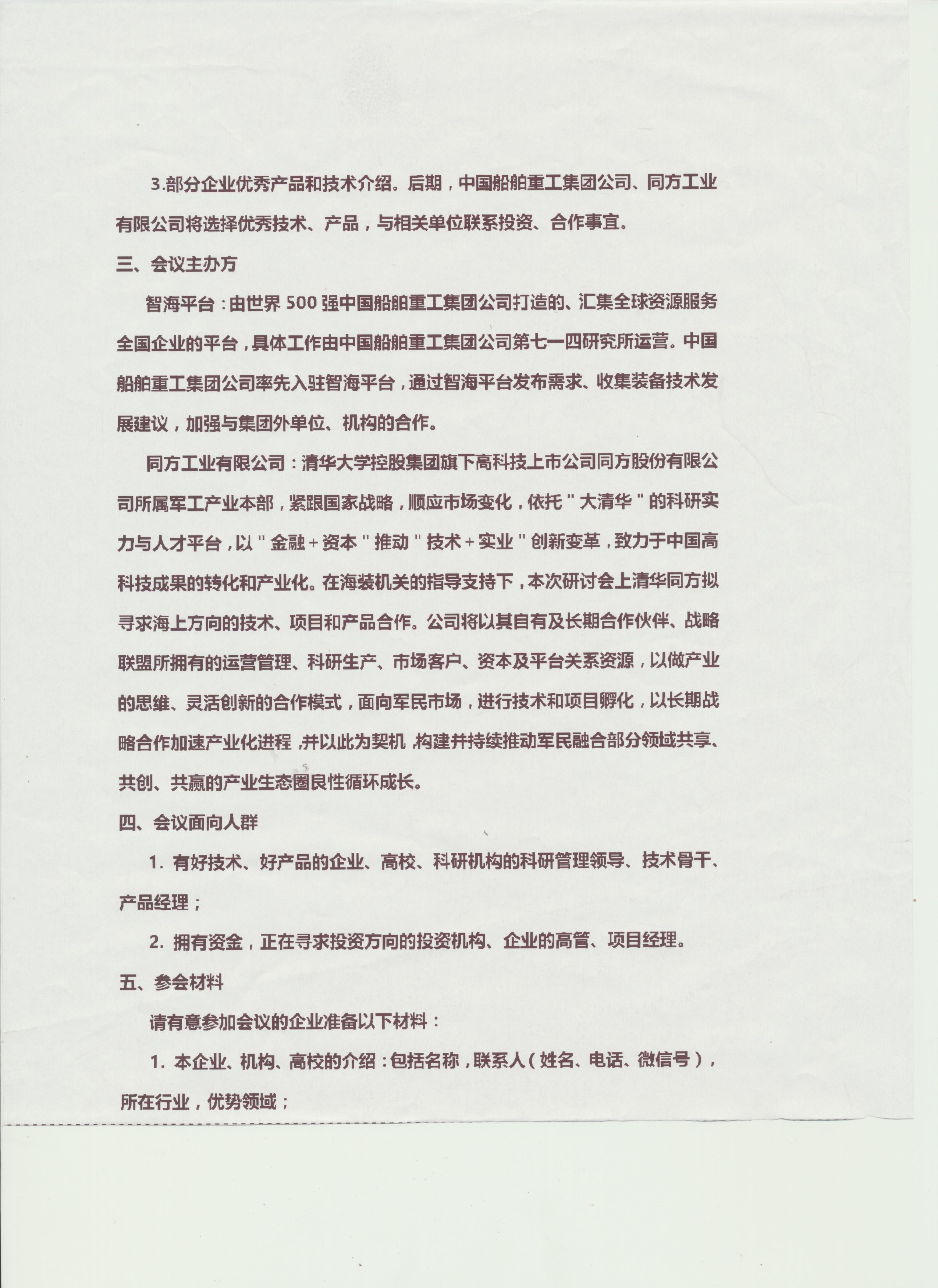 中国船舶重工集团公司第714研究所拟定于12月21日在北京召开“先进技术、产品推介与智能平台需求发布”(引导参与海军和中国船舶重工集团公司科研、采购项目,促进资本与技术对接)研讨会,旨在寻找优势产品和技术,向海装机关、军工企业和投资机构推荐;促进拥有优势产品和技术的企业、高校、科研机构进入军品科研生产与采购;促进中国船舶重工集团公司、同方工业有限公司与优势企业、高校、科研机构的深度合作。