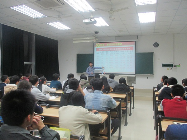 在简略的自我介绍之后,柯老师介绍了2014年底的基层组织总数、全国的党员数、福建省及成人网站 党员的基本情况。他并向同学们讲明发展党员的不同成熟阶段、党员的审核过程,包括对家人、本人情况的审核等。柯老师引用江泽民主席的“不信仰宗教是做一个合格共产党员的起码条件”,强调共产党人不信仰宗教。紧接着他就如何端正入党动机展开论述:先是介绍、分析入党动机的类型,并指出正确的入党动机。为了让同学们更好理解,柯老师解释了正确入党动机的内涵、端正入党动机的重要性与端正入党动机的途径,帮助同学们尽快端正入党动机。课程最后,柯老师和同学们分享了他的人生经验:要学着让自己伟大;要脚踏实地,言行一致,不只是做了,而是要做到;学会坚持正确的选择;每天淘汰你自己,寻找别人的优点。柯老师鼓励大家尽早端正入党动机,认真完成学业、工作,争取早日站在党的红旗下。