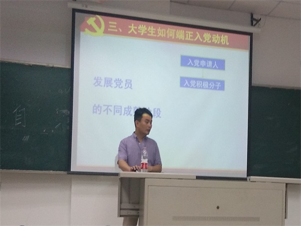 为领会习近平总书记系列重要讲话的基本精神,使学员加深对党章常规的理解,坚持以邓小平理论和“三个代表”重要思想为指导,深入贯彻落实科学发展观,不断践行“两行一做”,端正入党动机,中共成人网站 委员会分党校开展第十五期入党积极分子培训班教学计划。6月12日晚,校党委组织部柯江峰老师作为主讲人,在西2—208开讲了理论教学的第一课《如何端正入党动机》。