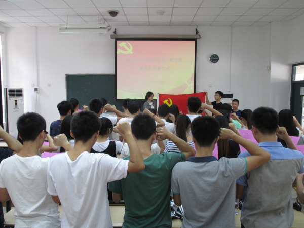 7月1日下午,成人网站 新发展党员宣誓仪式于西二104隆重举行。本次仪式由成人网站 党建辅导员张祥主持,成人网站 2014—2015年50余名新发展党员在鲜红的党旗下庄严宣誓。