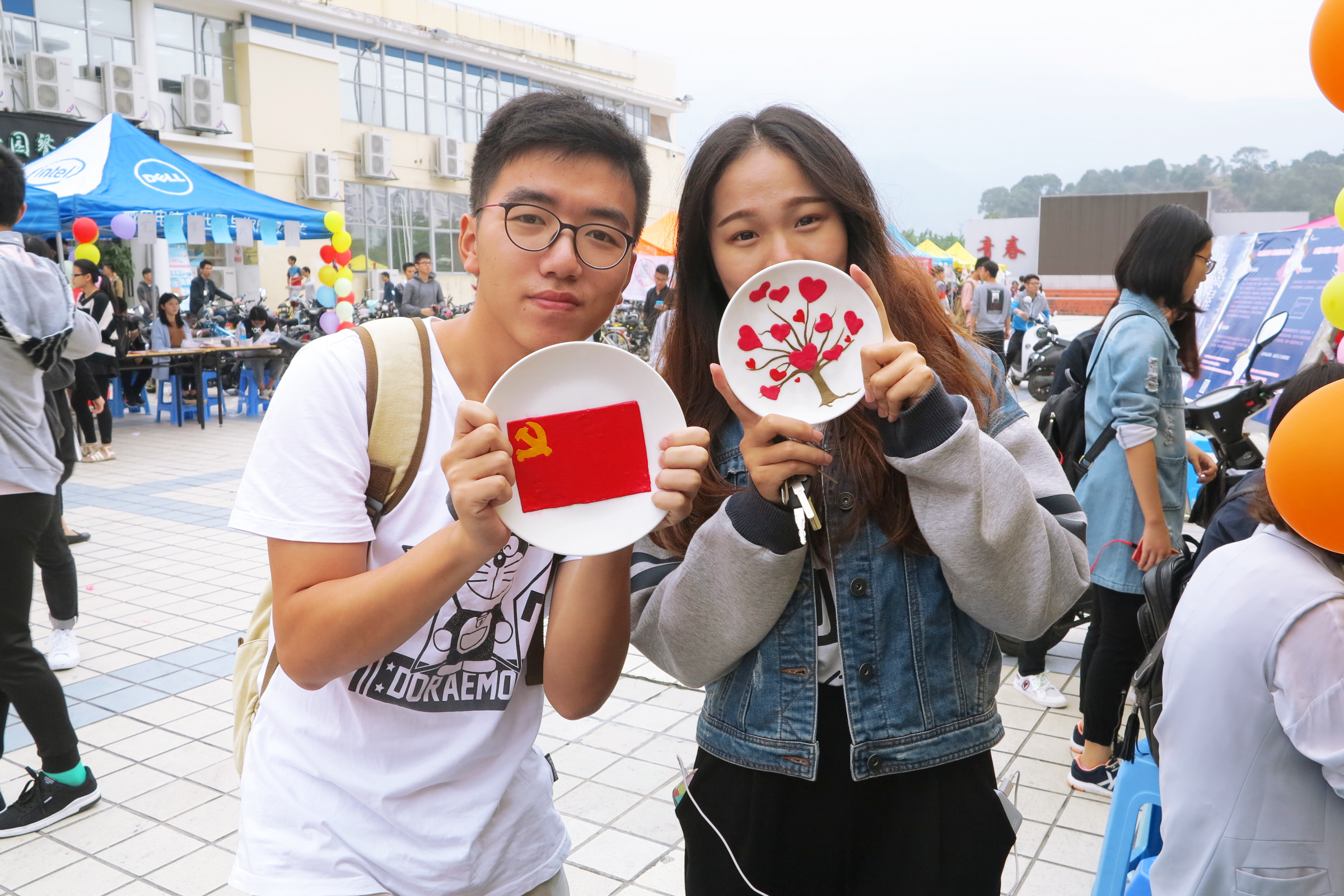 值得一提的是,在所有的作品中,最显眼的要数以白盘为基底,以中国红为主体所制作的党旗。鲜艳党旗照我心,同学们用自己的行动表达了对党的崇高敬意。