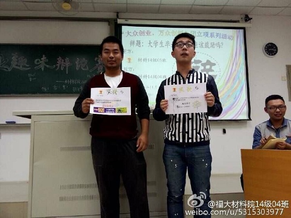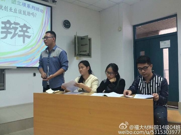为了引导帮助班上广大团员青年深入了解当前大学生就业与创业的难题。11月1日,成人网站 14级3班团支部携手14级4班团支部开展了“趣味创业辩论赛”,组织支部成员共同就“大学生一毕业就创业该不该鼓励?”这一辩题展开了激烈的辩论,辩论赛由校主持队王玉琪同学主持,评委由院辩论队队长陈俊宾同学及两班同学代表担任。