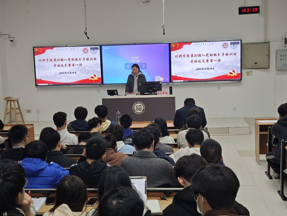 12月4日晚,材料学院分党校第30期入党积极分子培训班开班仪式暨第一讲在西2-101顺利举行。马克思主义学院刘志坚副教授、材料学院团委牛秋月书记、专职辅导员张庭士老师和全体培训班学员参加了此次活动。