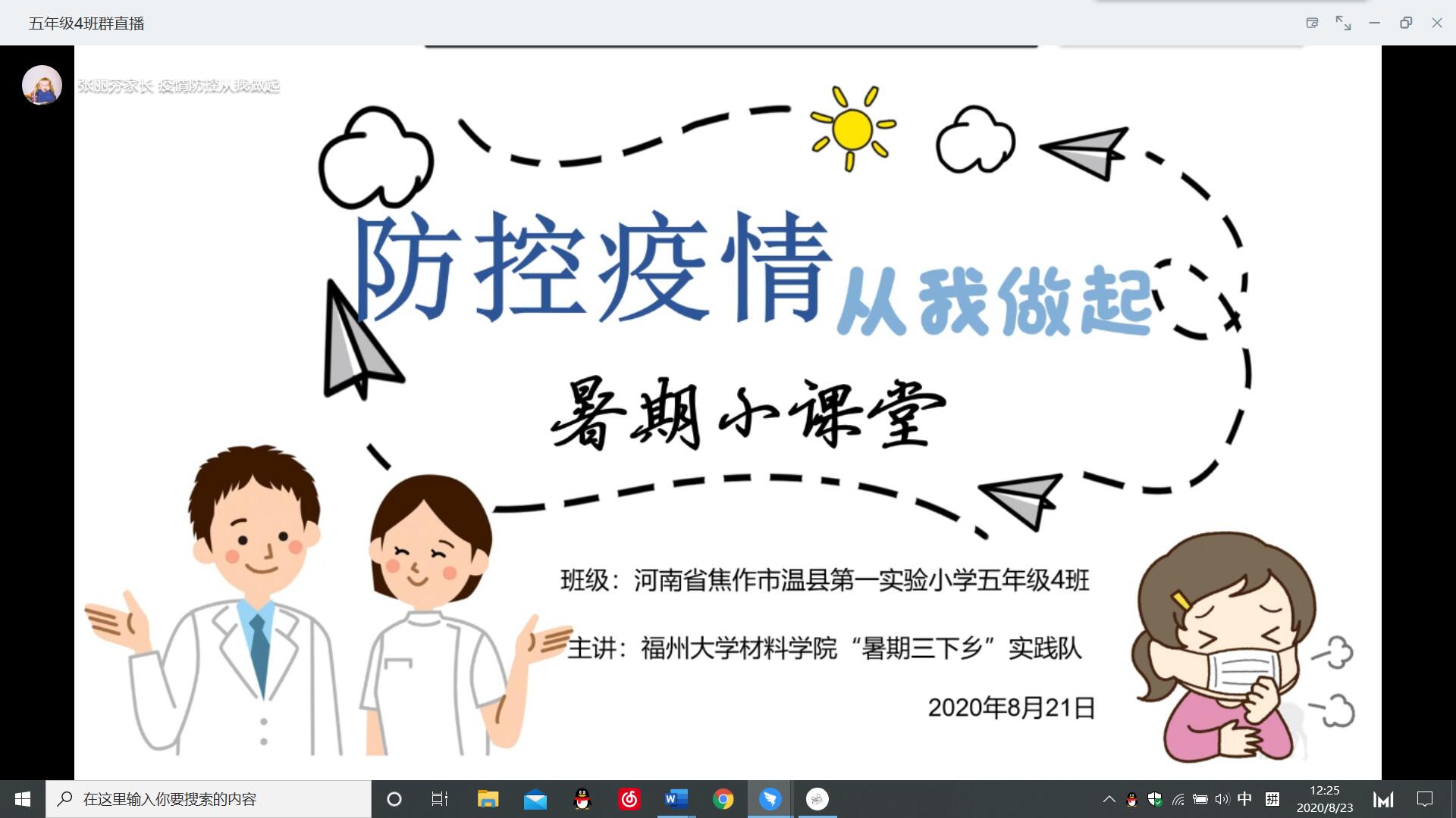8月21日晚,成人网站 材料学院三下乡实践队在线上进行了《防控疫情,从我做起》第二次暑期小课堂。实践队队员张丽芬与林福文是本次小课堂的主讲人。