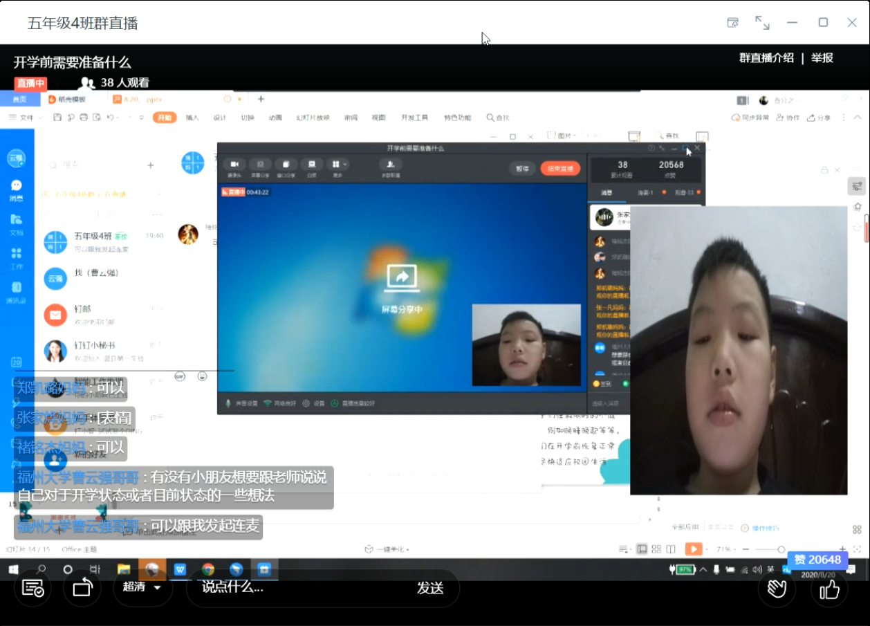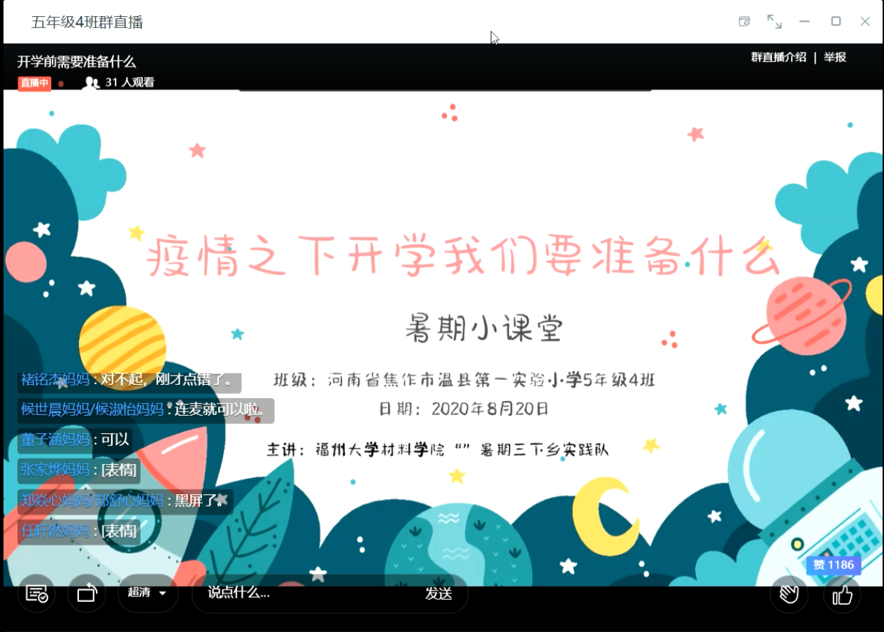 为了深入学习和贯彻习近平新时代中国特色社会主义思想特别是习近平总书记关于青年工作的重要思想,通过社会实践坚定理想信念、站稳人民立场,根据疫情防控常态化形式,贯彻落实学校号召,8月20日晚,成人网站 材料学院暑期三下乡实践队在线上平台召开了《疫情之下开学我们要准备什么》暑期小课堂。河南省焦作市温县第一实验小学5年级4班的全体学生和家长参与了本次活动。实践队队员曹云强是本次小课堂的主讲人。
