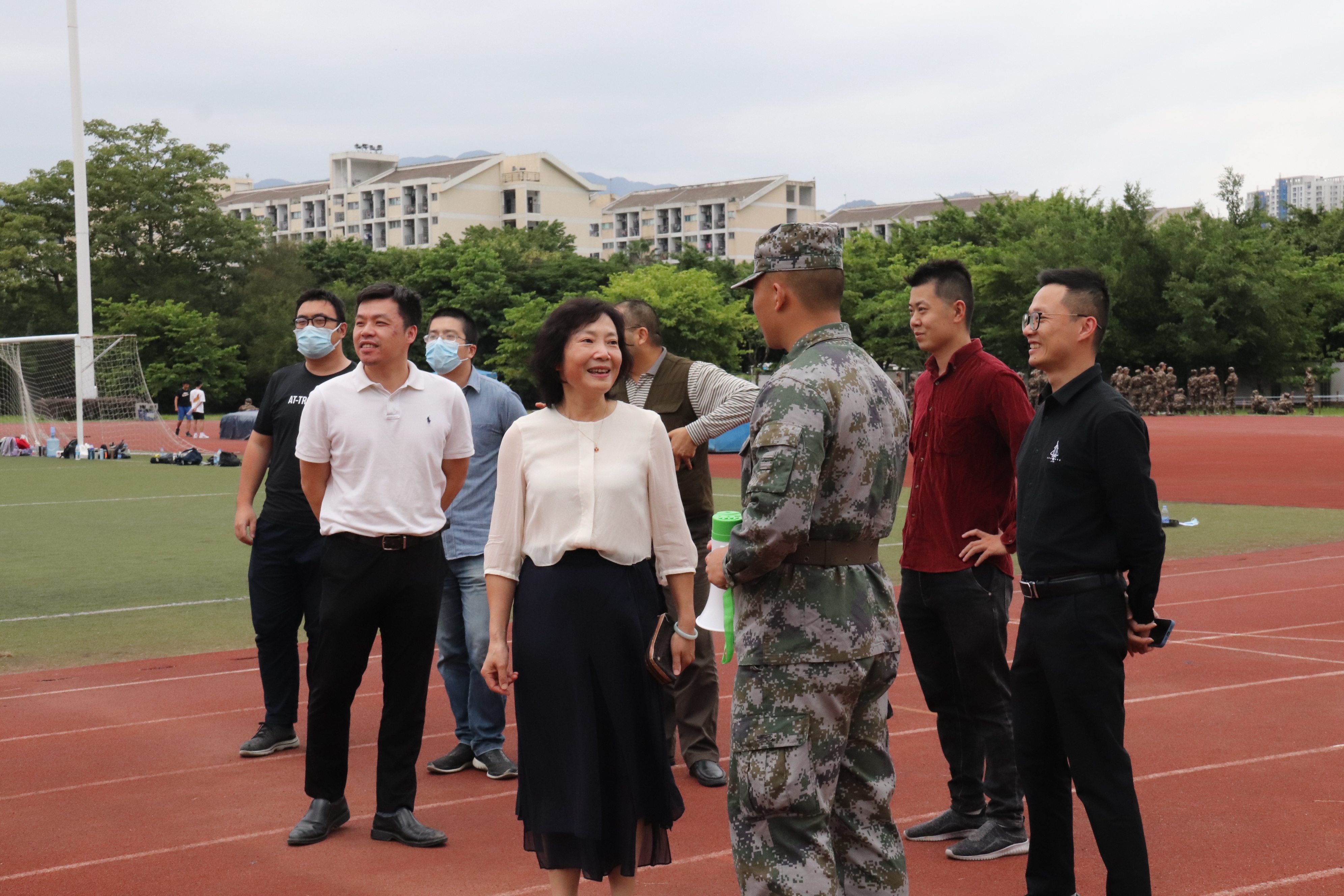 为深入了解新生军训情况,鼓励新生积极参训,以达到更好的训练效果,10月18日下午,成人网站 党委倪朝霞书记、党委王剑龙副书记、林枞副院长、辅导员王文栋及21级各班班主任前往田径场慰问教官和视察新生军训情况。