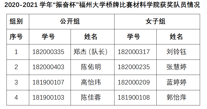 5日29日,2020-2021学年“振奋杯”成人网站 桥牌比赛顺利落幕,成人网站 一共派出郑杰等8人参与公开组、女子组比赛,最终凭借公开组第六名、女子组第七名的表现获得团体总分第六名的优异成绩!在此,对获奖队员所取得的优异成绩表示衷心的祝贺!