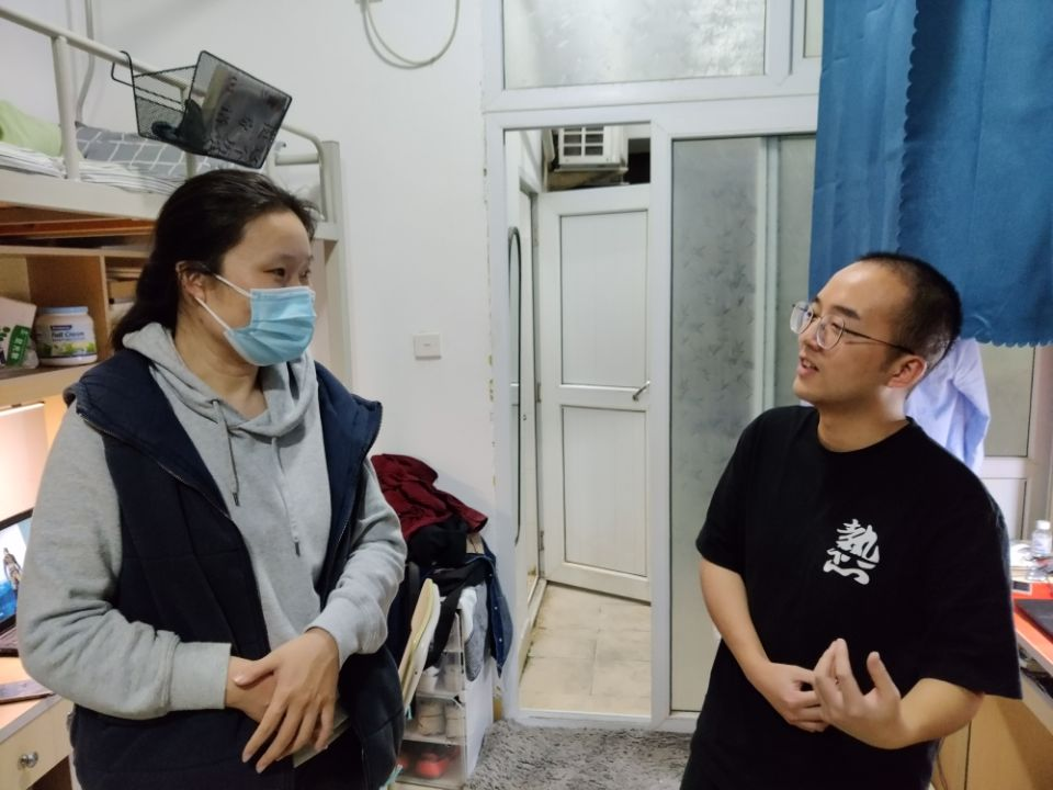 随后辅导员老师带领主要干部走访学生宿舍,对卫生、用电等防疫、安全情况进行摸排。在走访过程中,牛秋月老师对环境卫生较好、布置整洁的宿舍进行表扬,对存在问题的宿舍提出了整改意见。牛秋月老师强调,在疫情期间,同学们首先需要保持好环境卫生,及时清理垃圾,餐盒快递包装等不宜长期堆放在宿舍,建议同学们定期进行集体大扫除;其次要增强消防意识,注意用电安全,电线排插不上床、不空插,坚决杜绝违规电器;最后告知学生不串门、不聚集、不网购、不点外卖、多看书、少玩游戏,早睡早起,养成良好生活习惯,营造浓厚学习氛围,共同打好疫情阻击战。