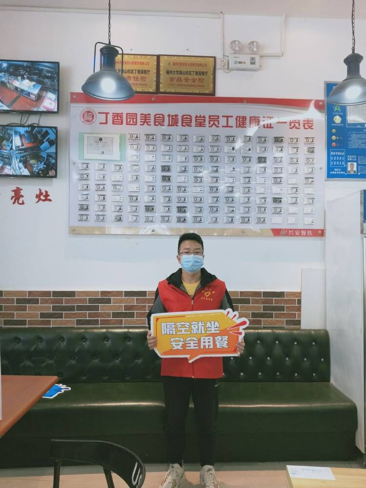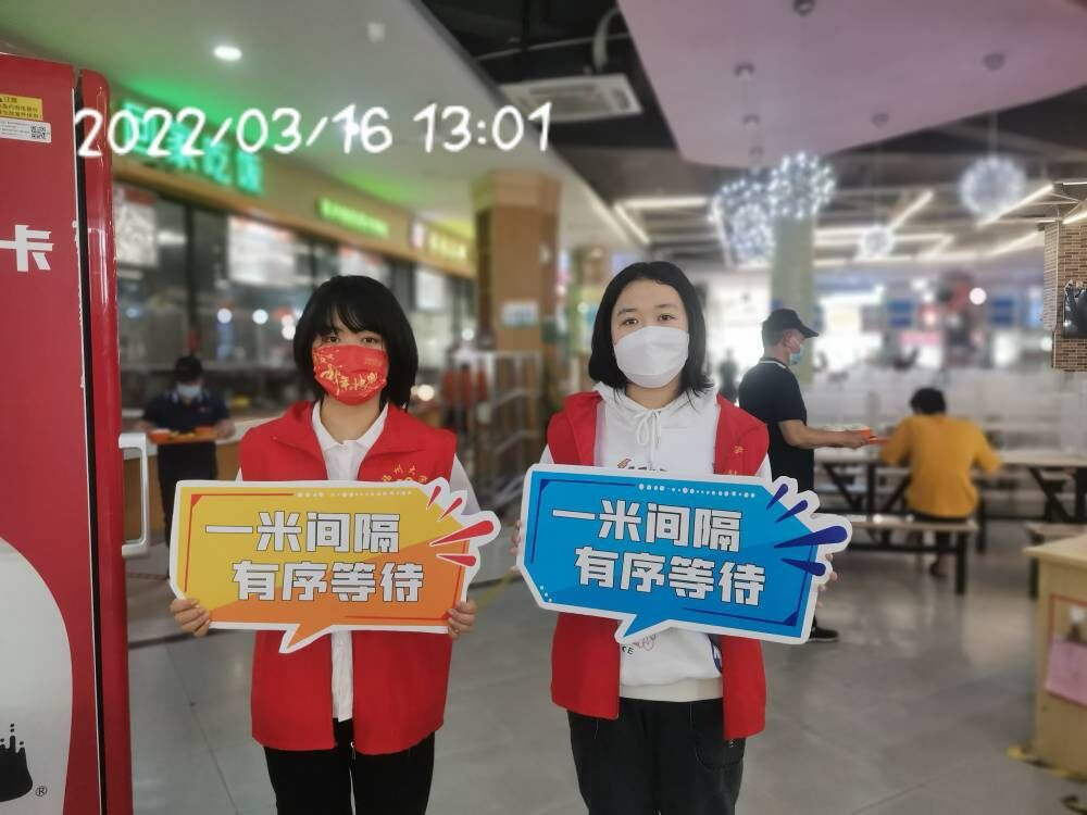 用餐高峰期前,党员突击队成员佩戴好绶带在食堂等待就绪。即使人流量不是很大,突击队队员们依旧一丝不苟,提醒着每一位进入食堂的同学戴好口罩。同时党员突击队队员们举着疫情防控标语,在食堂的每一处地方督导,让每一位用餐者更好地增强疫情防控意识。在用餐高峰期时,突击队队员维持着餐厅的秩序,把控用餐师生间距在1米左右。