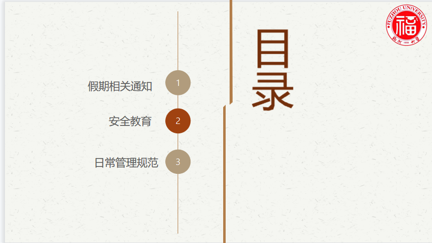 会上,牛秋月老师从五一假期相关通知、安全教育、日常管理规范三个方面对相关事项进行传达,同时通报了近期学校相关安全案例。牛秋月老师强调,目前虽然已恢复市内当日往返自助报备外出,但仍需严格遵守学校疫情防控相关规定,离开校区所在设区市的同学需办理请假手续,返校需提供48小时核酸阴性报告,返校后按规定及时参与核酸检测。牛秋月老师指出,安全无小事,各位同学在日常学习生活中应注意实验室安全、交通安全、财产安全、用电安全等各方面安全,提高自我保护能力,确保生命和财产安全。同时,牛秋月老师就请假规范、今日校园签到规范和晚点名规范等日常管理进行了再提醒再强调。