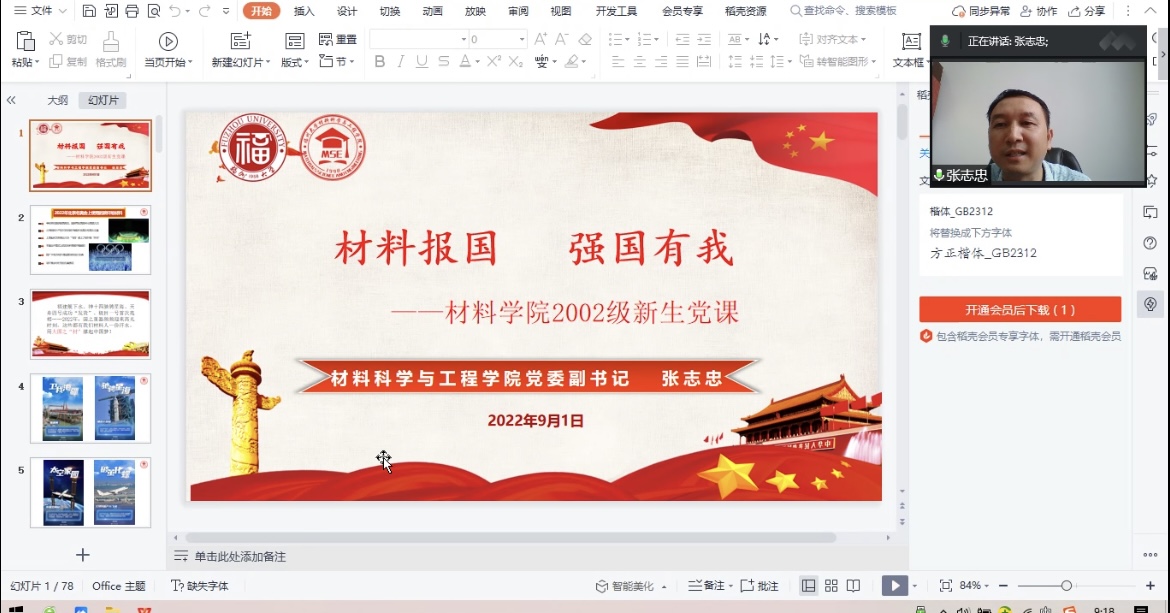 为落实立德树人的根本任务,呼吁新材料人谨记党的教诲,传承红色精神,成为优秀的社会主义接班人,9月1日上午,我院通过线上平台举行了主题为“材料报国,强国有我”的思政第一课专题讲座,本次大会由成人网站 党委张志忠副书记主持,材料学院2022级全体新生参与。