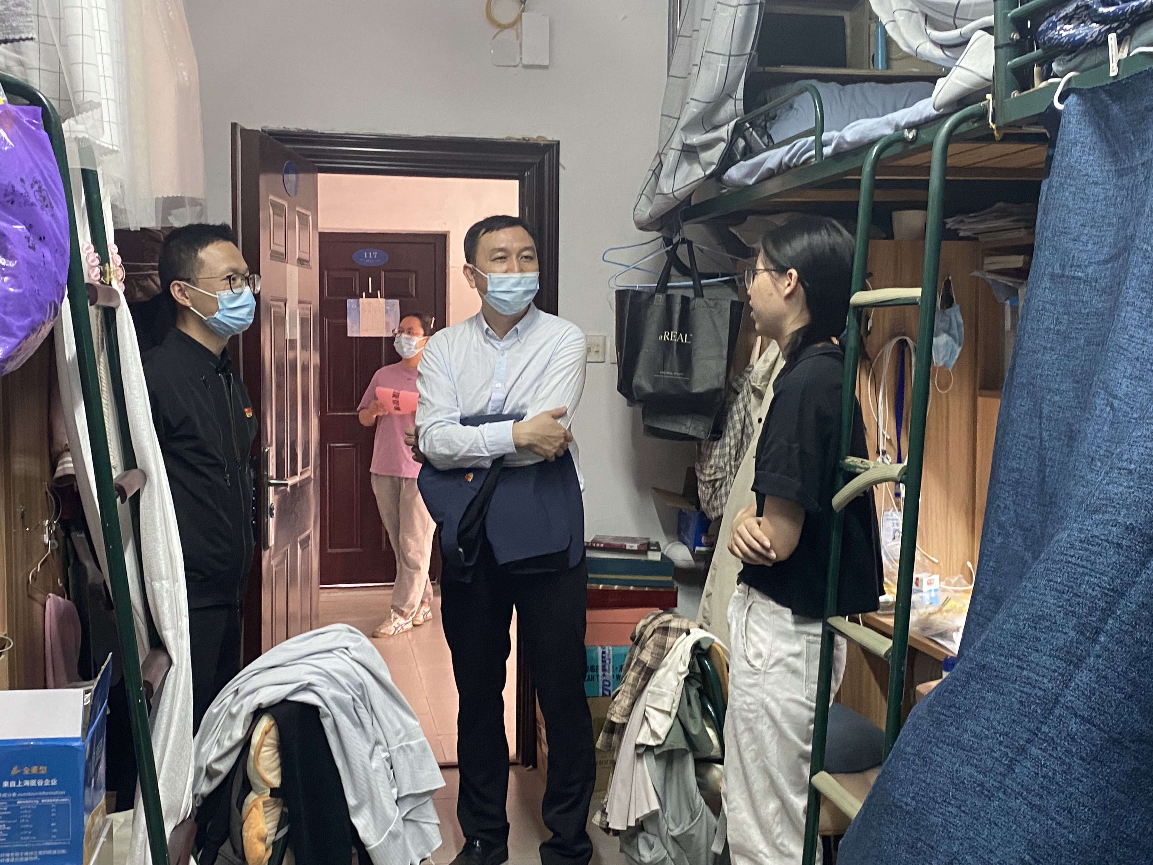 10月29日,为关心学院学生疫情期间的情况,材料学院党委张志忠副书记、辅导员王怡老师、王文栋老师、兼职辅导员郑晨宇老师走访宿舍慰问同学们。