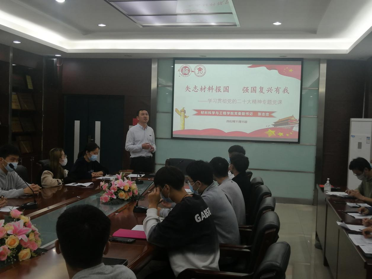 11月15日晚7点,材料学院于嘉锡楼313顺利开展主题为“矢志材料报国,复兴强国有我”的学习贯彻党的二十大精神专题党课。党课由院党委张志忠副书记主讲,2020级研究生2班党支部书记牛秋月主持,20级2班研究生党支部全体党员参与。