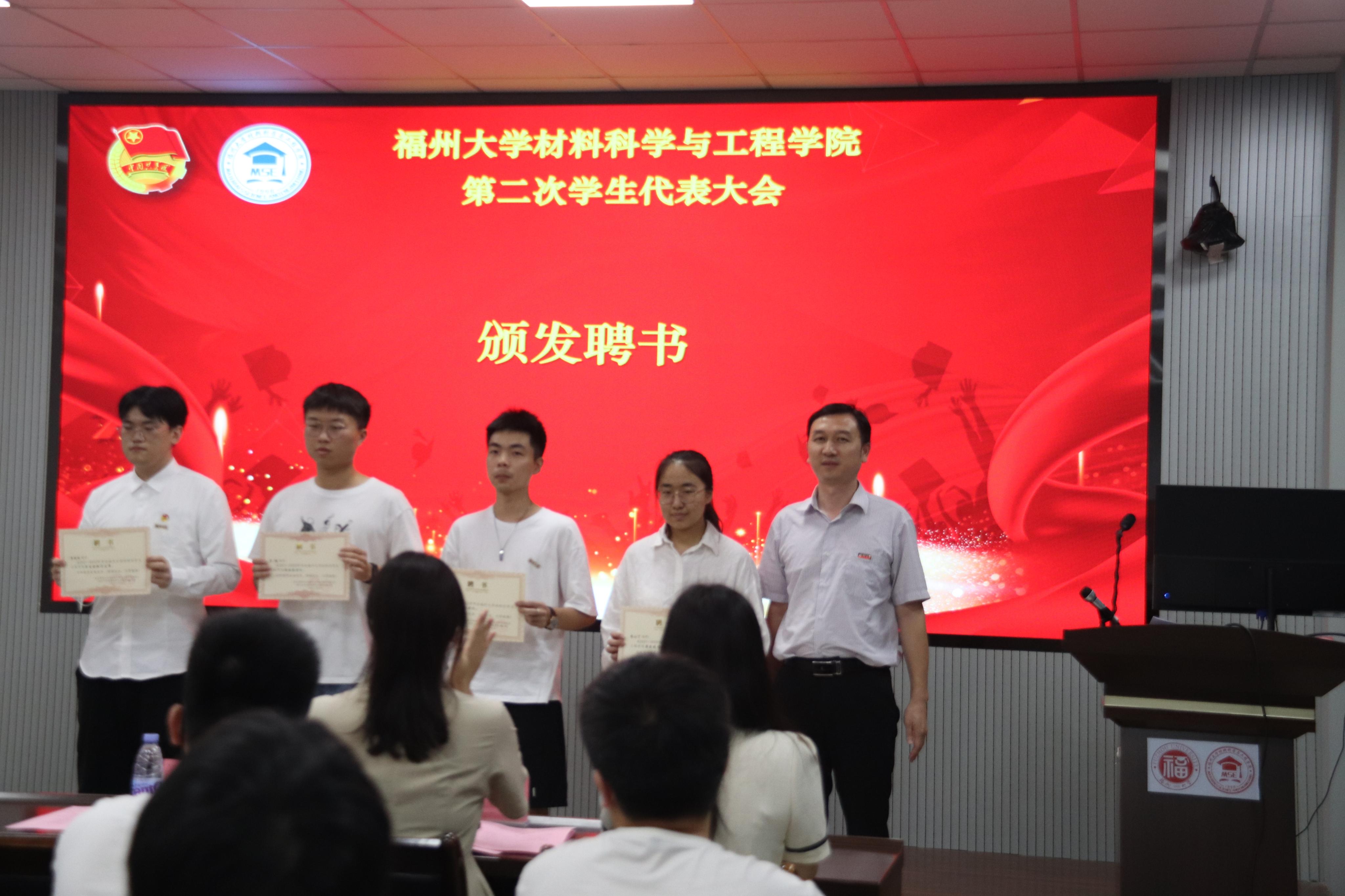 第二次学生代表大会正式开始,全体起立,奏唱中华人民共和国国歌。国歌奏毕,团委书记牛秋月老师为上一届学生会主席团及部门负责人颁发聘书。