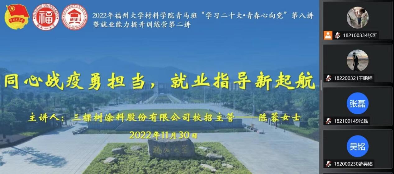 活动特邀三棵树涂料股份有限公司校招主管陈蓉女士进行讲解,材料学院党委张志忠副书记、团委牛秋月书记出席活动,共计106名学生线上参会。