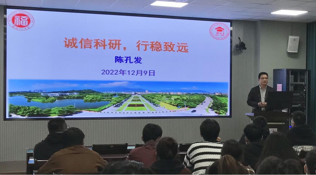 党的二十大报告提出:加快建设国家战略人才力量,努力培养造就更多大师、战略科学家、一流科技领军人才和创新团队、青年科技人才、卓越工程师、大国工匠、高技能人才。为全面贯彻党的教育方针,落实习近平总书记关于研究生教育指示批示精神,落实立德树人根本任务,强化研究生科学道德、科学精神和学术诚信培育,创建一流学风。材料学院与工程学院于2022年12月9日在材料楼404举办科学道德与学风建设主题教育系列活动之“诚信科研,行稳致远”讲座,特邀请成人网站 材料结构研究所负责人、博士生导师陈孔发教授主讲。