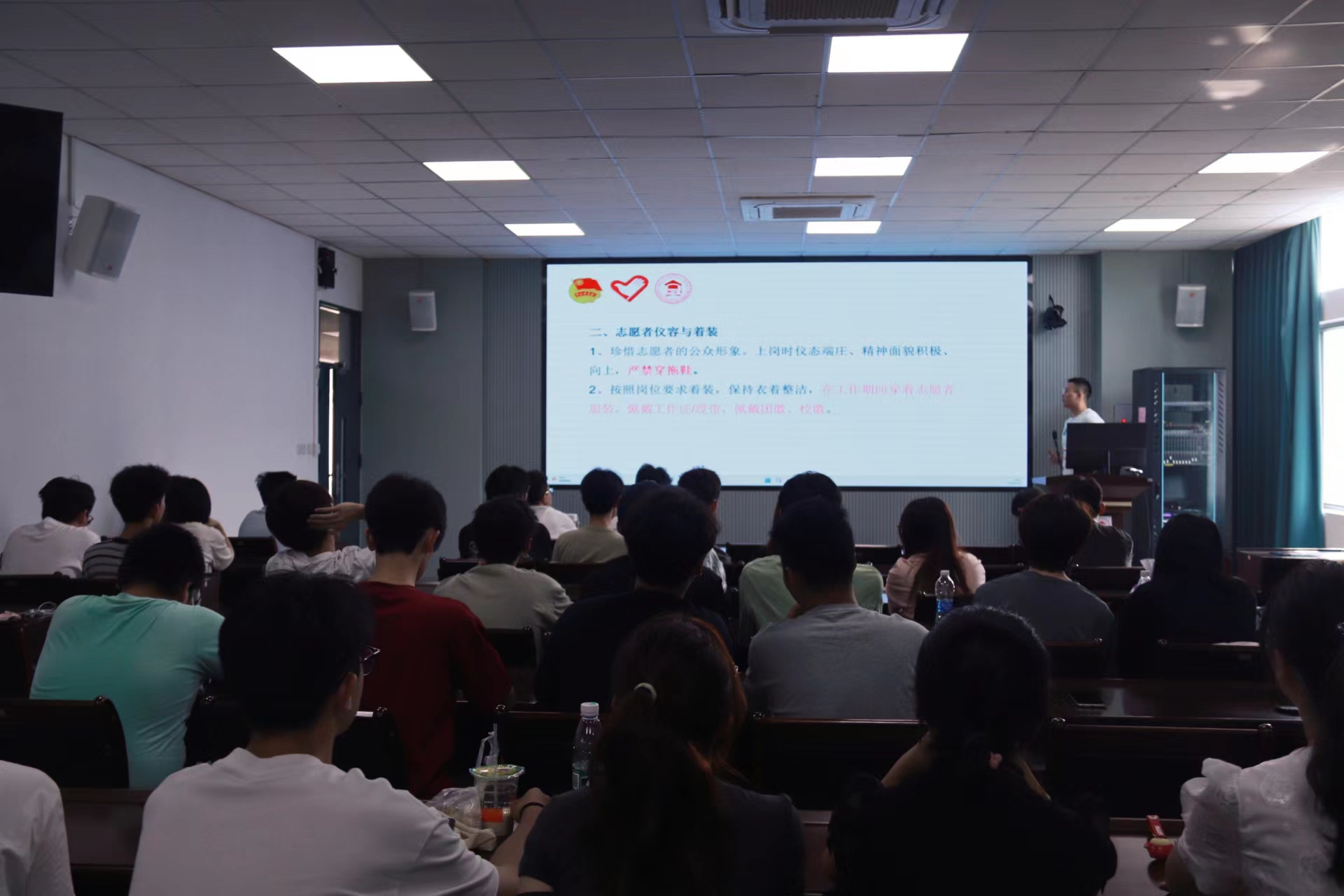 会上,研究生会执行主席袁姣楠就志愿者形象、志愿者礼仪、后勤保障以及校纪校规四方面进行培训。牛老师强调了志愿者应当注意自身形象、遵守校纪校规,在服务期间满怀热情,以保证自身安全为前提,全心全意为新生同学服务,学院也会为志愿者提供充足的后勤保障。