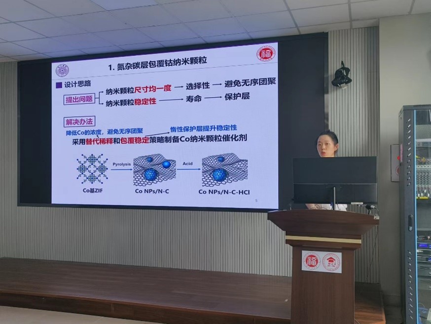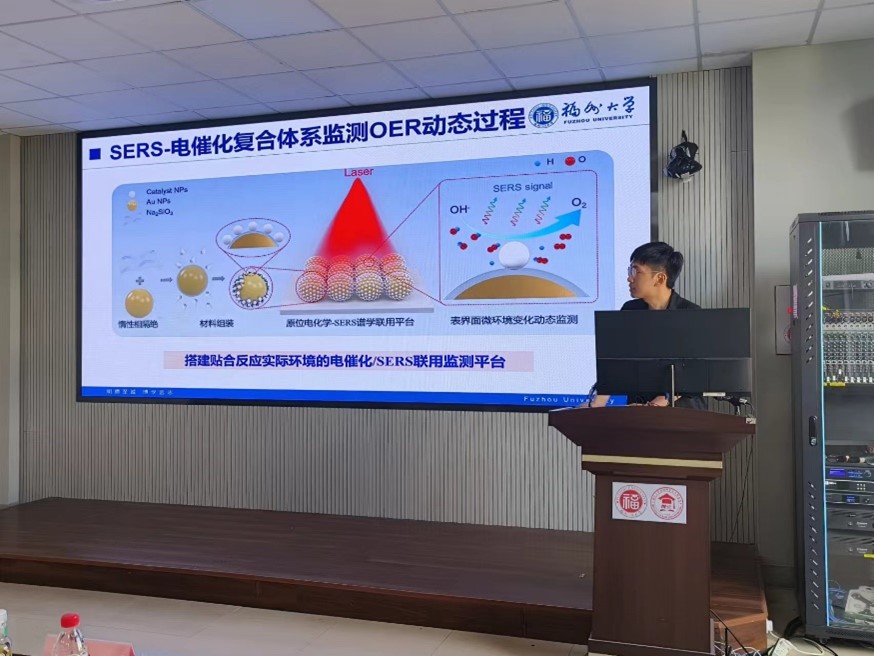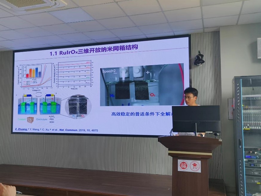 庄泽文、吴悦和吴策军三位老师围绕在校期间从事的科研项目分别给大家作了题为《纳米电催化材料的理性设计和原子级调控》、《非贵金属单原子与纳米催化剂的构筑及其性能研究》、《表面增强拉曼光谱研究电催化反应的活性物种》的精彩报告。报告中三位老师首先介绍课题的研究思路,其次分析其研究进展,最后向大家详细讲述了课题课题的进行过程以及取得的成果。同学们聚精会神,受益匪浅,会议室不断传出阵阵掌声。