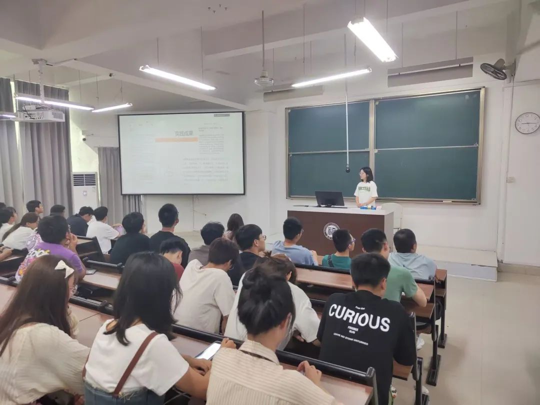 郑嘉莉同学向23级新生介绍了“三下乡”实践活动的基本信息以及如何去报名。接着,郑嘉莉同学就着实践队活动的开展向同学们介绍着她们在追寻习近平总书记足迹路上取得的成果,也表示这次实践活动磨练了队员的意志,在看到祖国变好的同时,也看到了不足之处,实践队成员更加深刻地认识到学好专业知识,注重产学转化的重要性。